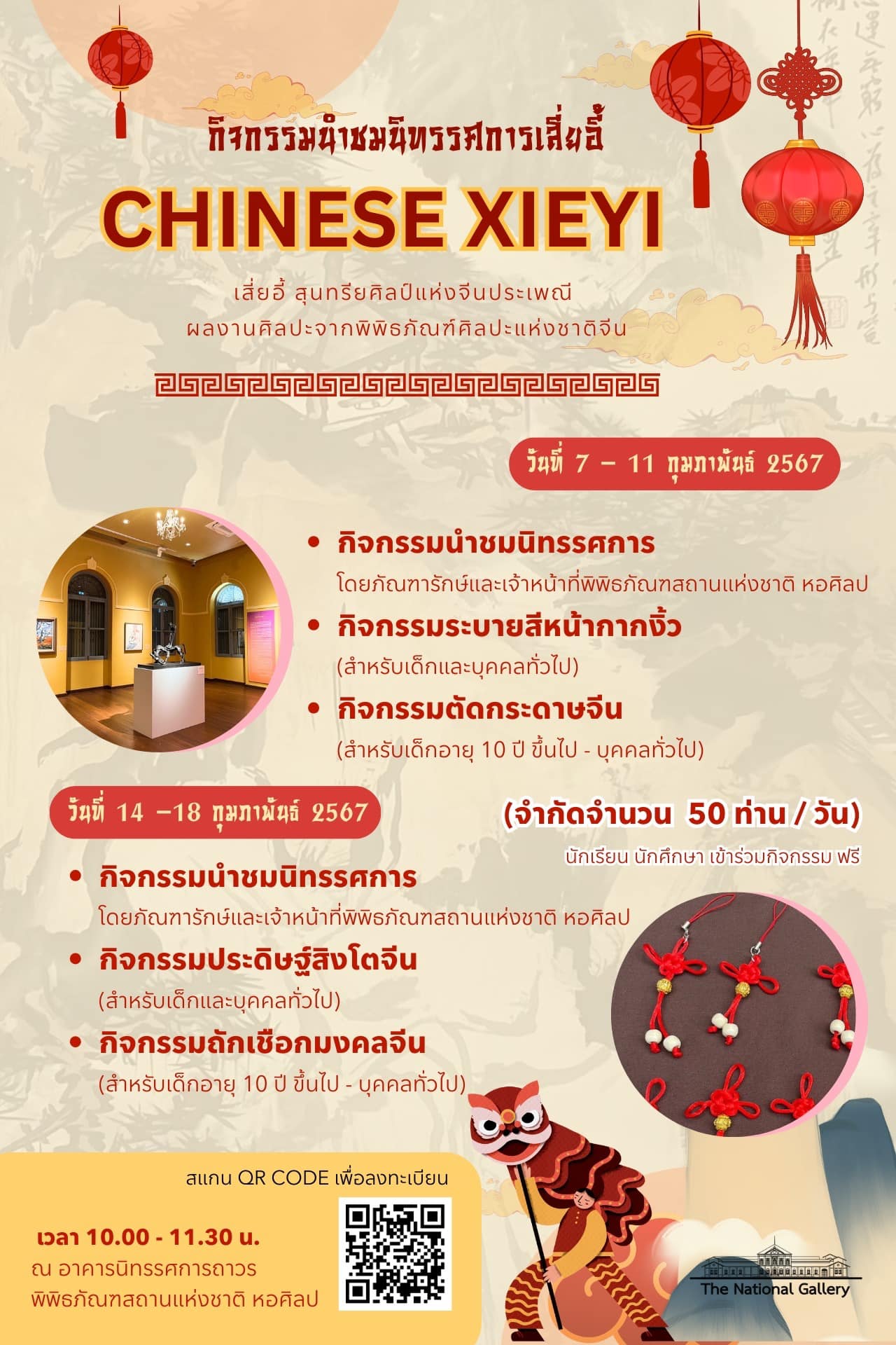 พิพิธภัณฑสถานแห่งชาติ หอศิลป ขอเชิญชวนร่วมกิจกรรมดี ๆ สำหรับสถาบันการศึกษา และผู้ที่สนใจในศิลปวัฒนธรรมจีน ในวันที่ 7 - 11, 14 - 18 กุมภานี้ ซึ่งเป็นส่วนหนึ่งของกิจกรรมในนิทรรศการพิเศษ “เสี่ยอี้” : สุนทรียศิลป์แห่งจีนประเพณี ผลงานศิลปะจากพิพิธภัณฑ์ศิลปะแห่งชาติจีน ซึ่งในครั้งนี้เอาใจกลุ่มเด็ก ๆ และเยาวชนจากสถาบันการศึกษาและผู้ที่สนใจในศิลปวัฒนธรรมของจีนเป็นพิเศษ โดยเชิญชวนมาร่วมสัมผัสและเรียนรู้ประวัติศาสตร์วัฒนธรรมจีนผ่านนิทรรศการศิลปะร่วมสมัยของจีนในสไตล์ “เสี่ยอี้” รายละเอียดกิจกรรม ดังนี้