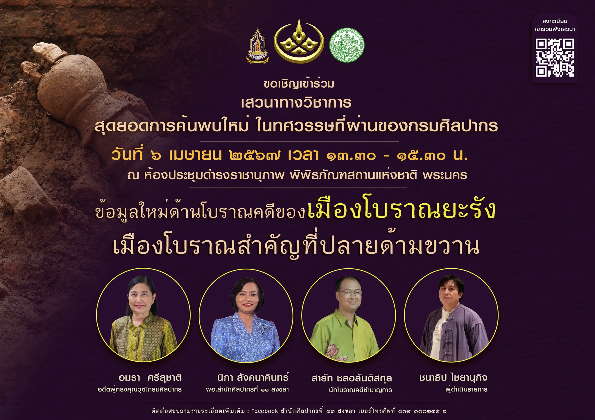 กรมศิลปากร ขอเชิญชวนผู้สนใจ ลงทะเบียนเข้าร่วมฟังการเสวนาทางวิชาการเนื่องในสัปดาห์วันอนุรักษ์มรดกไทย พุทธศักราช 2567 “สุดยอดการค้นพบใหม่” ในทศวรรษที่ผ่านมาของกรมศิลปากร ระหว่างวันที่ 3 – 8 เมษายน 2567 ณ ห้องดำรงราชานุภาพ พิพิธภัณฑสถานแห่งชาติ พระนคร