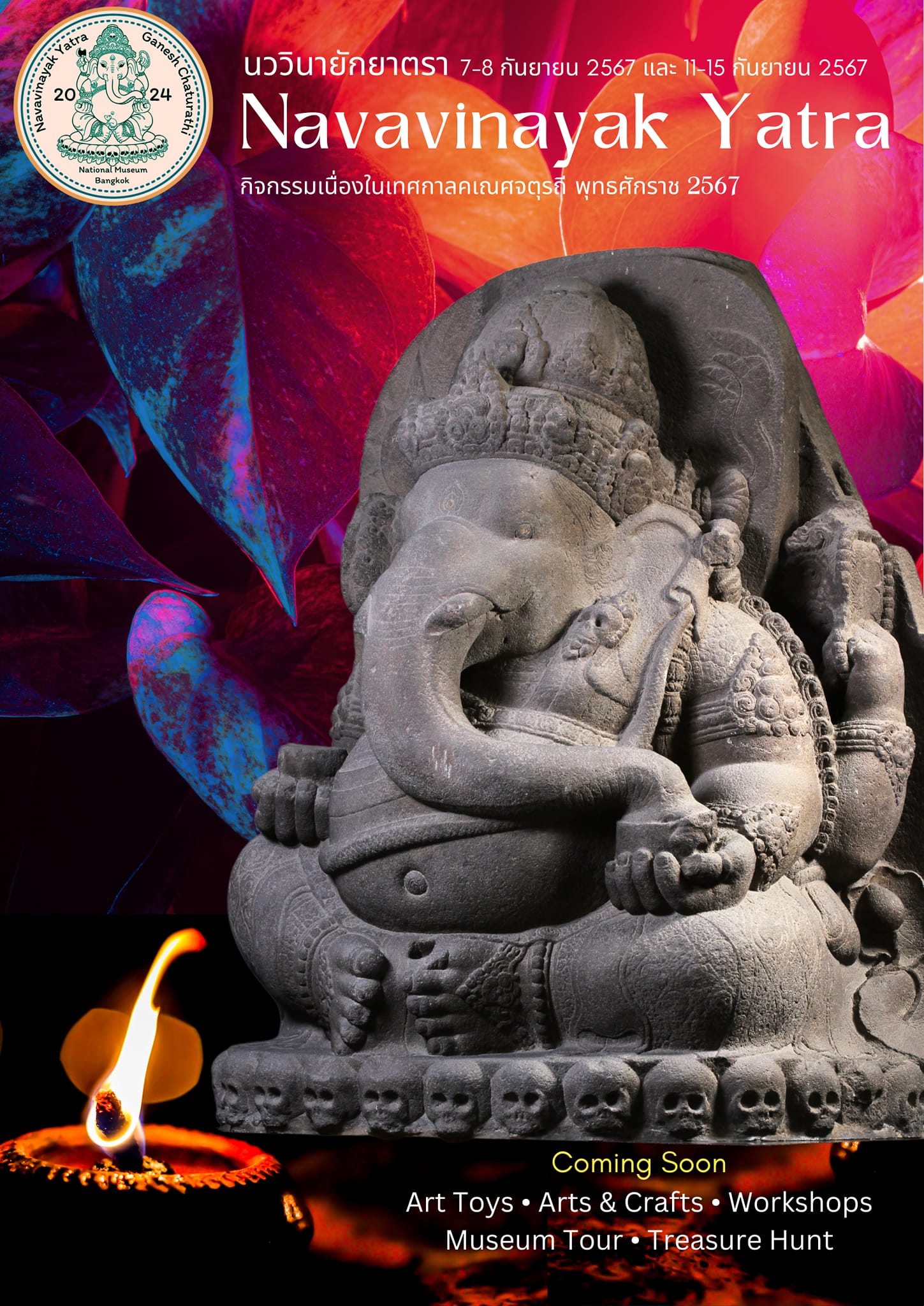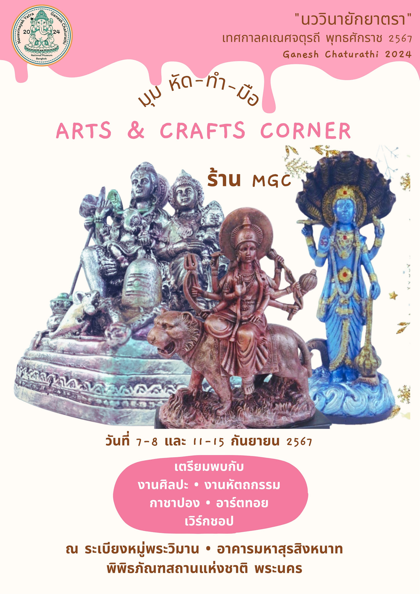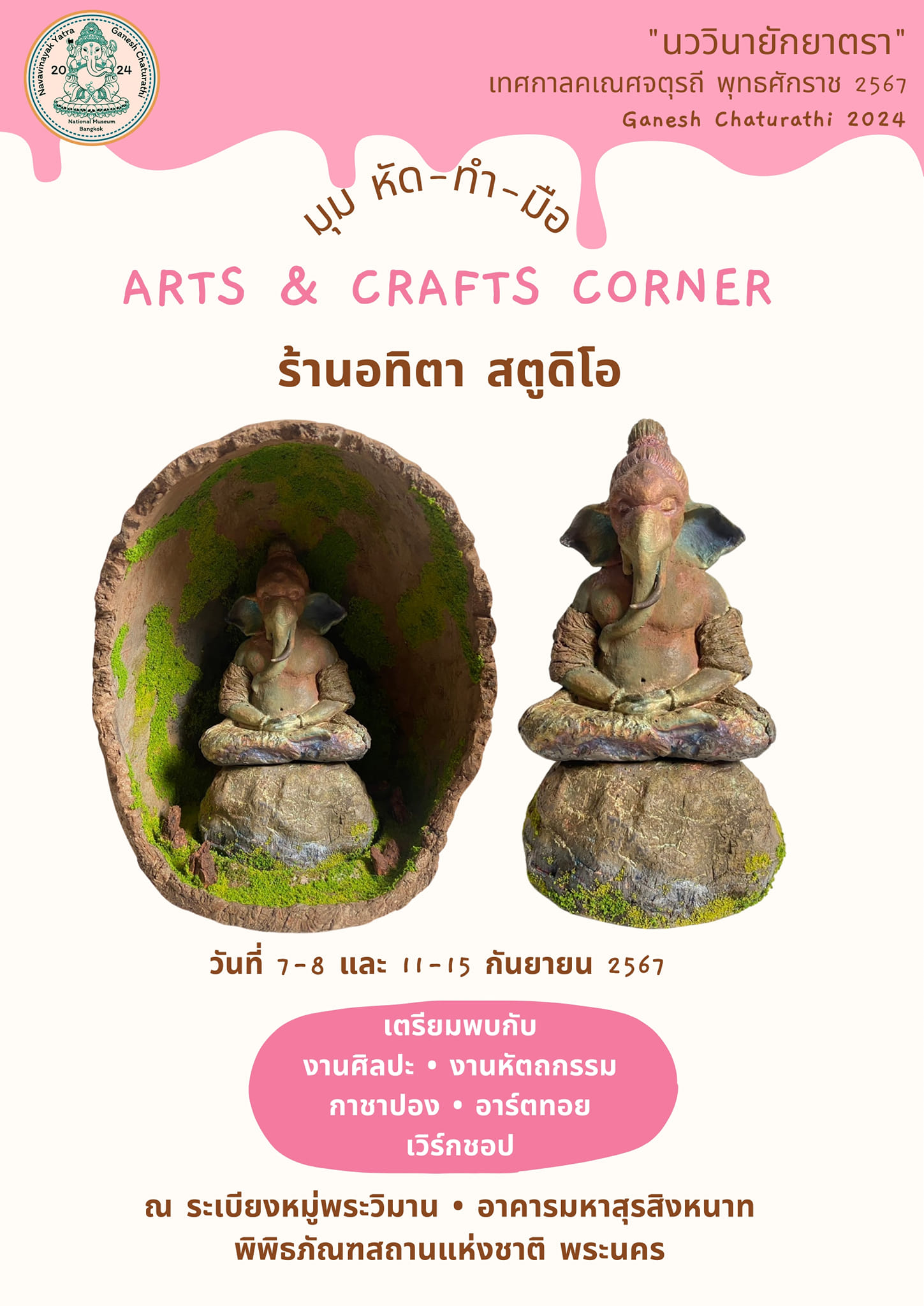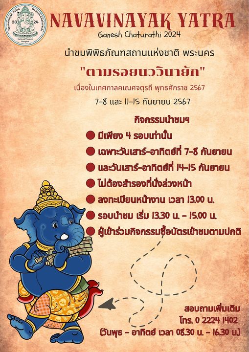 พิพิธภัณฑสถานแห่งชาติ พระนคร จัดกิจกรรมส่งเสริมการเรียนรู้ ควบคู่กับความสนุกในรูปแบบต่าง ๆ ในหัวข้อ "นววินายักยาตรา" ซึ่งเป็นกิจกรรมเนื่องในเทศกาลคเณศจตุรถี พุทธศักราช ๒๕๖๗ วันที่ ๗ - ๘ กันยายน และ ๑๑ - ๑๕ กันยายน ๒๕๖๗ พบกับกิจกรรมพิเศษ ดังนี้