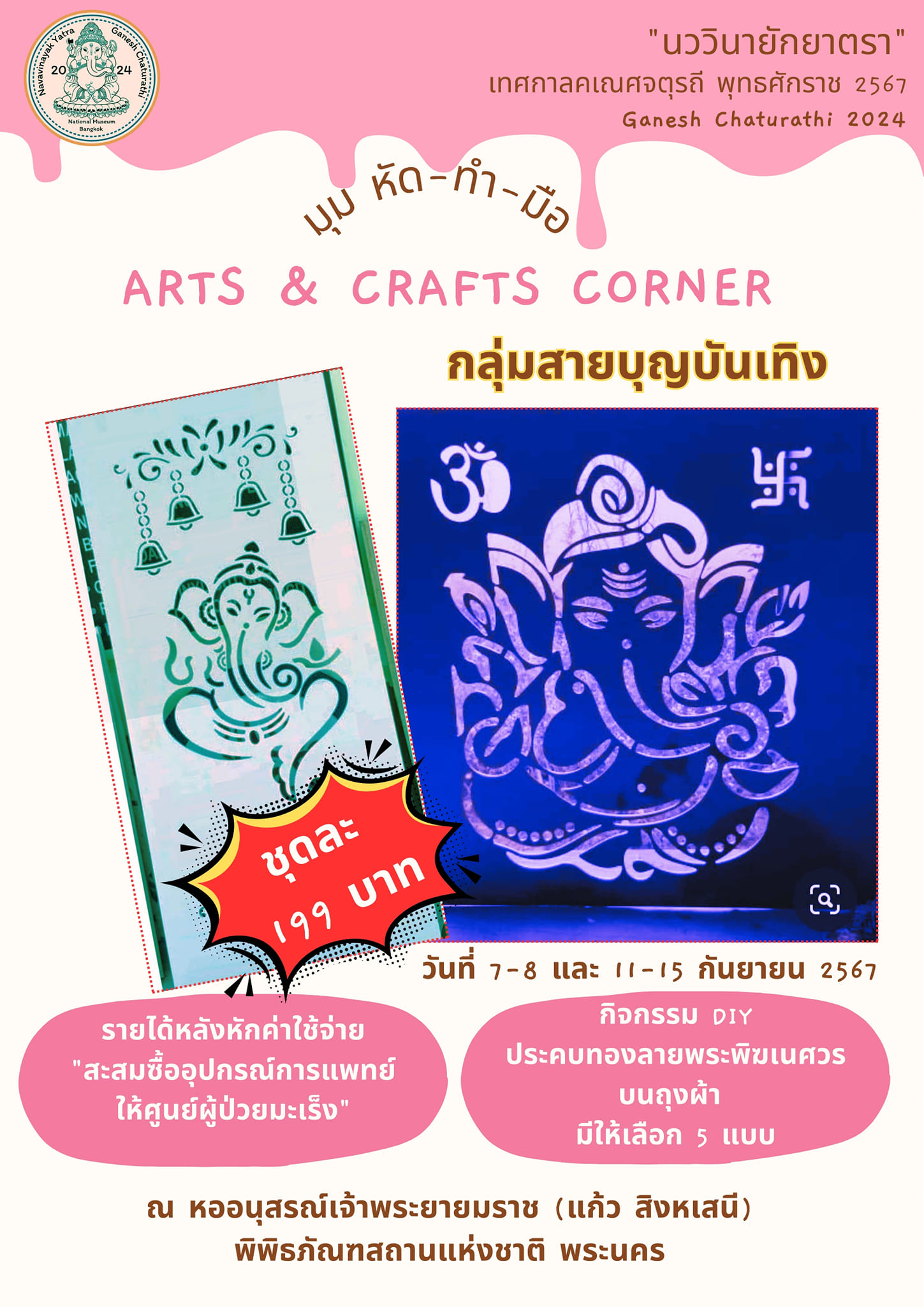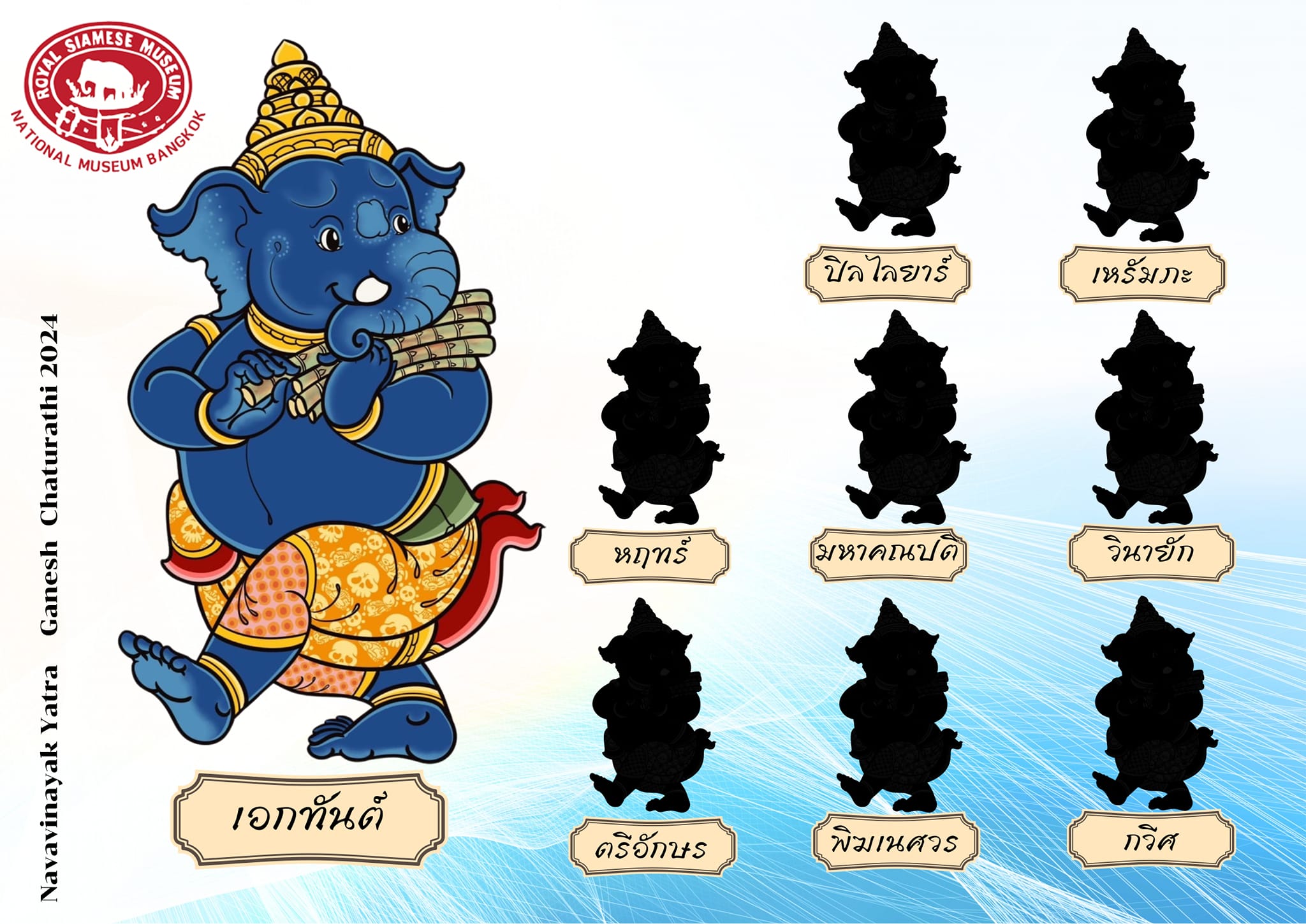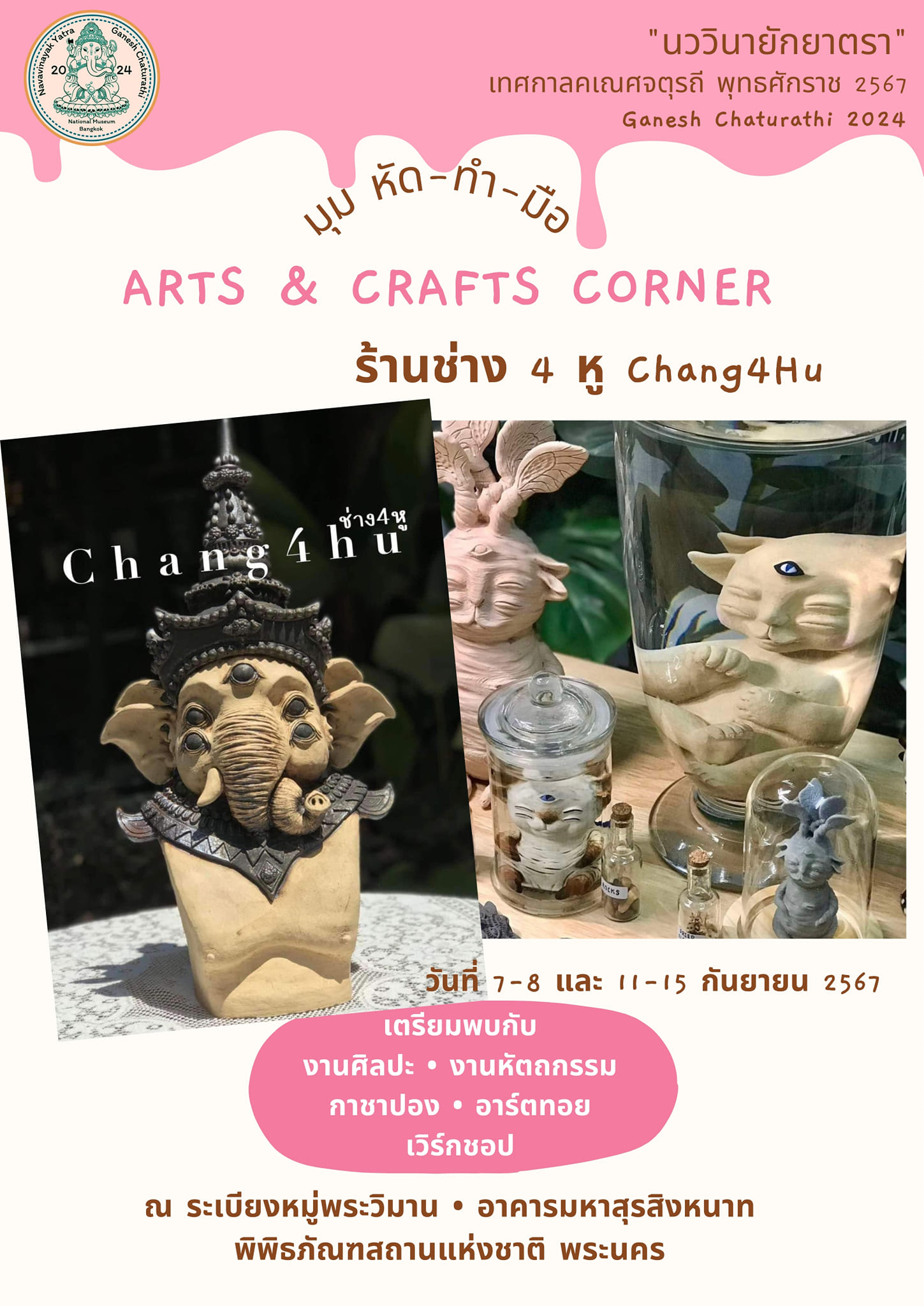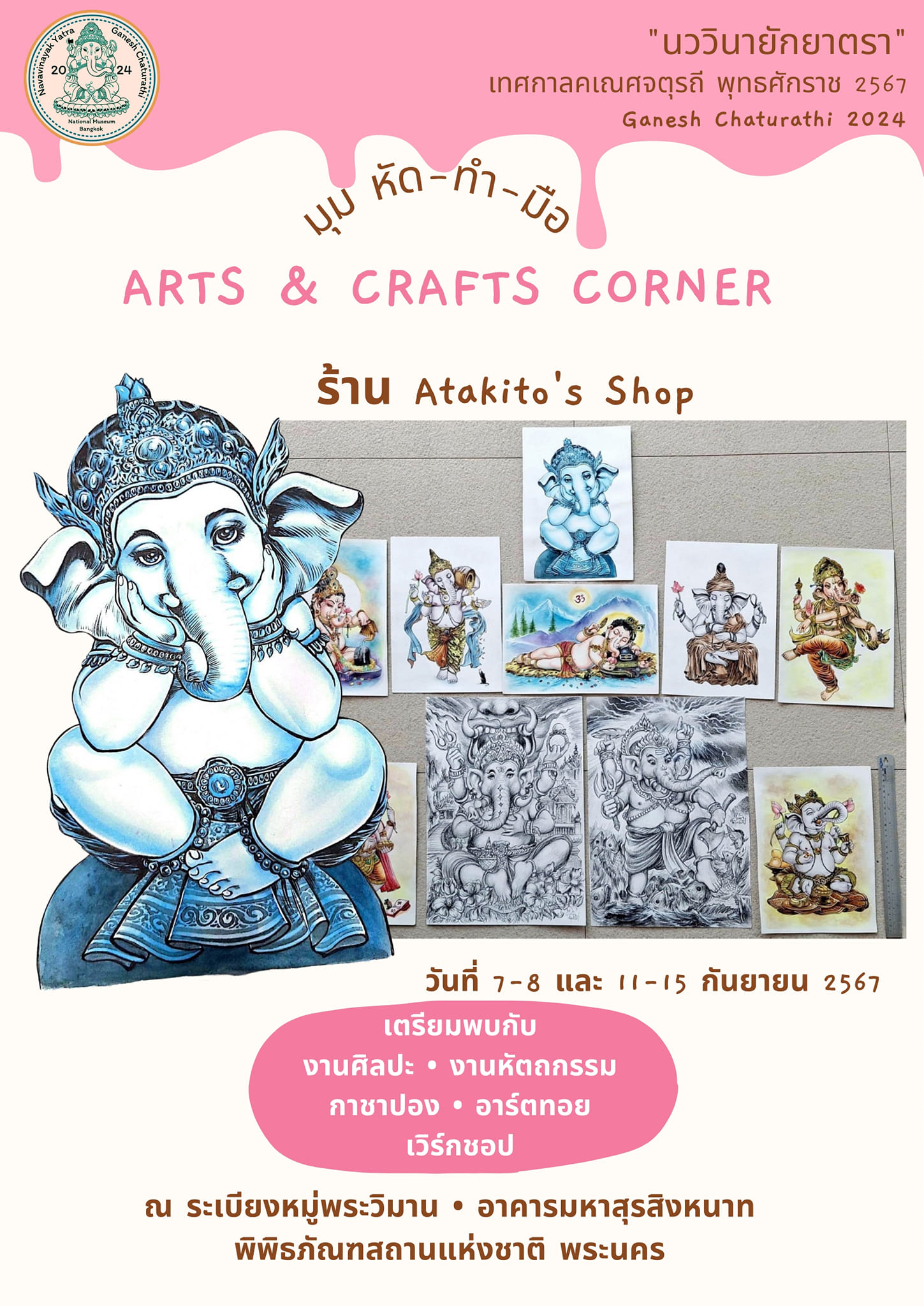 พิพิธภัณฑสถานแห่งชาติ พระนคร จัดกิจกรรมส่งเสริมการเรียนรู้ ควบคู่กับความสนุกในรูปแบบต่าง ๆ ในหัวข้อ "นววินายักยาตรา" ซึ่งเป็นกิจกรรมเนื่องในเทศกาลคเณศจตุรถี พุทธศักราช ๒๕๖๗ วันที่ ๗ - ๘ กันยายน และ ๑๑ - ๑๕ กันยายน ๒๕๖๗ พบกับกิจกรรมพิเศษ ดังนี้