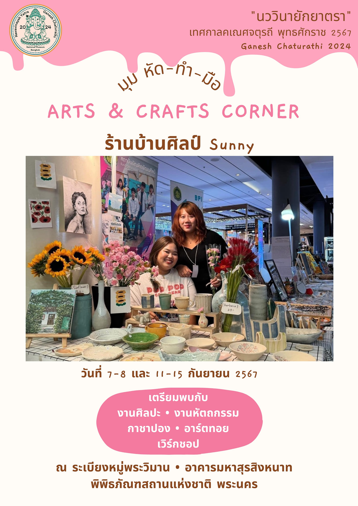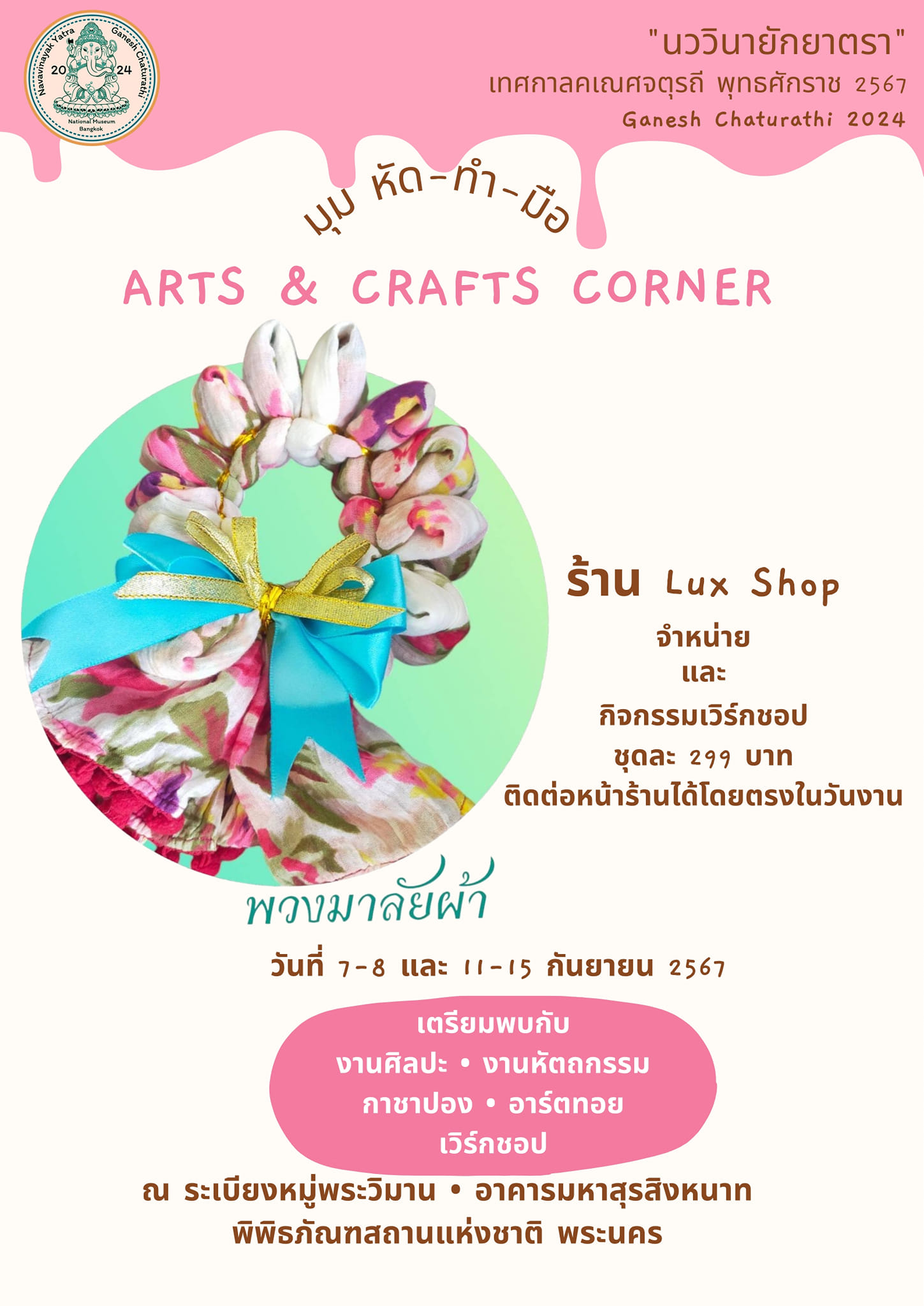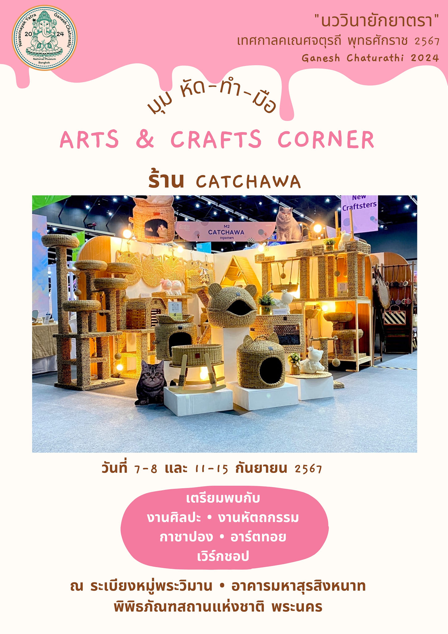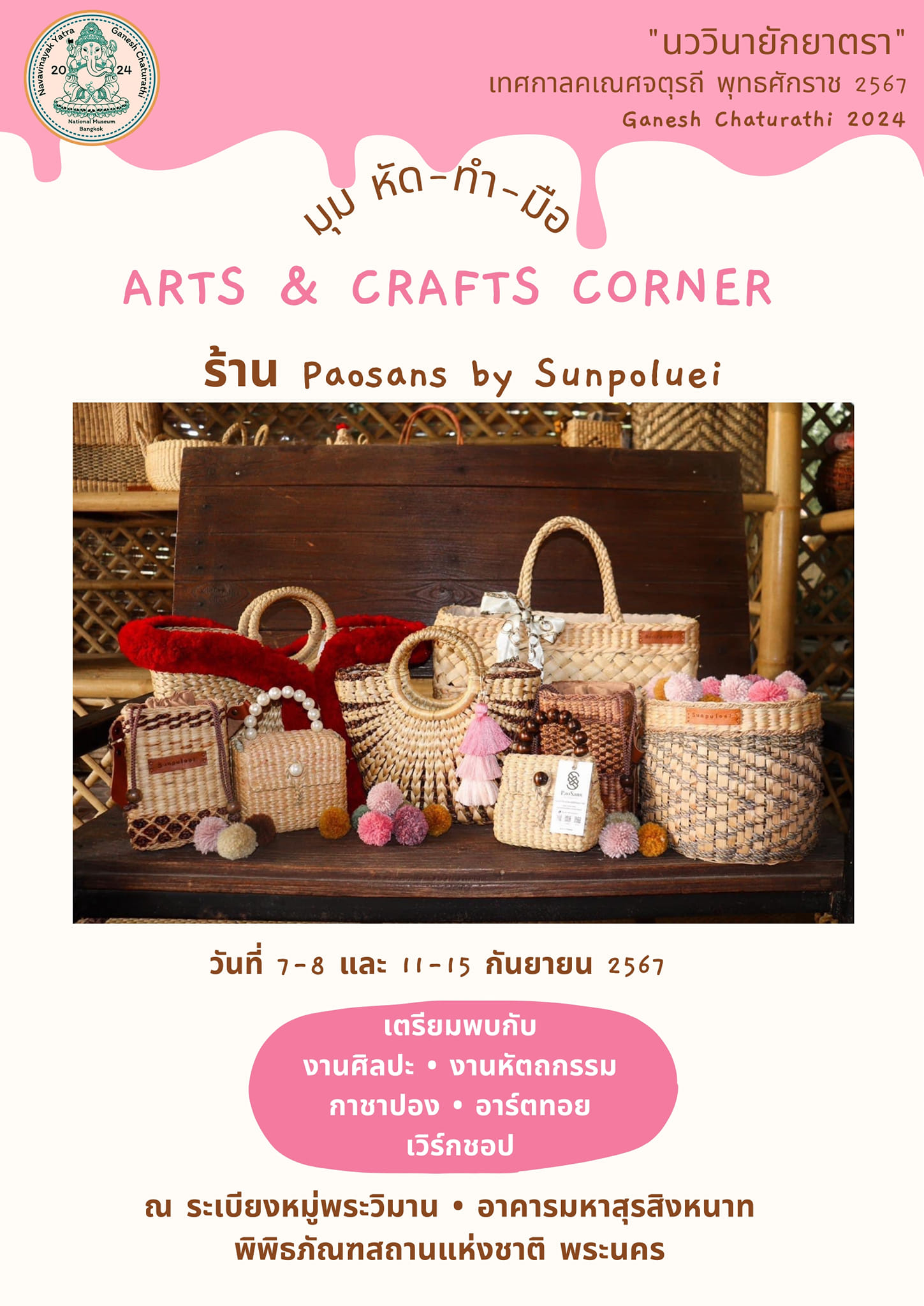 พิพิธภัณฑสถานแห่งชาติ พระนคร จัดกิจกรรมส่งเสริมการเรียนรู้ ควบคู่กับความสนุกในรูปแบบต่าง ๆ ในหัวข้อ "นววินายักยาตรา" ซึ่งเป็นกิจกรรมเนื่องในเทศกาลคเณศจตุรถี พุทธศักราช ๒๕๖๗ วันที่ ๗ - ๘ กันยายน และ ๑๑ - ๑๕ กันยายน ๒๕๖๗ พบกับกิจกรรมพิเศษ ดังนี้