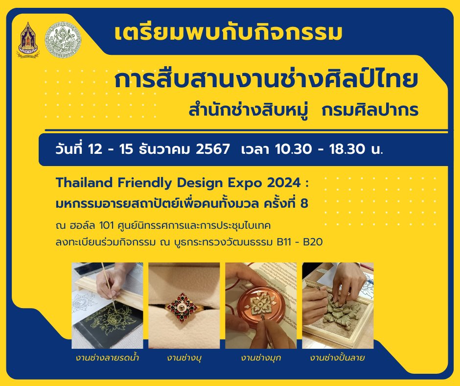 สำนักช่างสิบหมู่ ขอเชิญร่วมกิจกรรมการเผยแพร่องค์ความรู้ และกิจกรรม Work shop การสืบสานงานช่างศิลป์ไทย ของสำนักช่างสิบหมู่ กรมศิลปากร ประกอบด้วย งานช่างบุ งานช่างมุก งานช่างลายรดน้ำ งานช่างปั้นไทย และ Mobile Knowledge ภายในงาน Thailand Friendly Design Expo 2024 : มหกรรมอารยสถาปัตย์เพื่อคนทั้งมวล ครั้งที่ 8 ระหว่างวันที่ 12 – 15 ธันวาคม 2567 เวลา 10.30 – 18.30 น. ณ ฮอลล์ 101 ศูนย์นิทรรศการและการประชุมไบเทค (ลงทะเบียนร่วมกิจกรรม ณ บูธกระทรวงวัฒนธรรม B11 - B20)