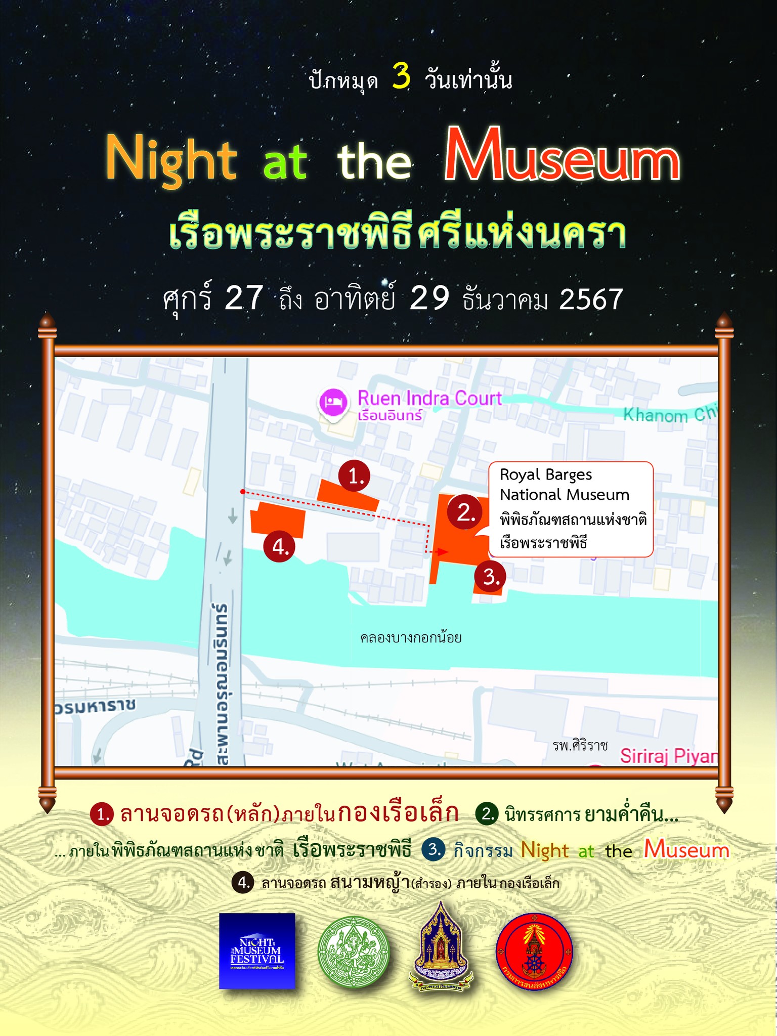 สำนักพิพิธภัณฑสถานแห่งชาติ กรมศิลปากร กระทรวงวัฒนธรรม ร่วมกับภาคีเครือข่าย จัดเทศกาลท่องเที่ยวพิพิธภัณฑ์ยามค่ำคืน “Night at the Museum เรือพระราชพิธี ศรีแห่งนครา” เปิดพิพิธภัณฑสถานแห่งชาติ เรือพระราชพิธี ให้เข้าชมความงดงามของเรือพระราชพิธี มรดกวัฒนธรรมอันทรงคุณค่าแห่งสายน้ำ ระหว่างวันที่ 27 - 29 ธันวาคม 2567 ตั้งแต่เวลา 09.00 น. - 20.30 น. ไฮไลท์อยู่ที่การแสดงเรือพระราชพิธีประดับแสงไฟในบรรยากาศยามค่ำคืน การแสดงเห่เรือประกอบการพายเรือ กิจกรรมเวิร์คชอบ การออกร้านสินค้าทางวัฒนธรรม และอาหารเลิศรสย่านบางกอกน้อย มีพื้นที่จอดรถในกองเรือเล็ก กรมการขนส่งทหารเรือ
