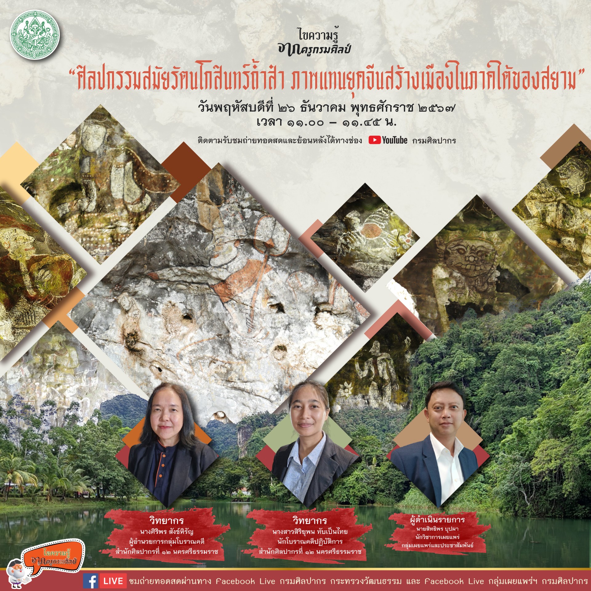 กรมศิลปากร ขอเชิญรับชมถ่ายทอด Facebook Live รายการไขความรู้จากครูกรมศิลป์ ตอน “ศิลปกรรมสมัยรัตนโกสินทร์ถ้ำสำ ภาพแทนยุคจีนสร้างเมืองในภาคใต้ของสยาม” วิทยากร นางศิริพร สังข์หิรัญ ผู้อำนวยการกลุ่มโบราณคดี สำนักศิลปากรที่ ๑๒ นครศรีธรรมราช และนางสาวสิริยุพน ทับเป็นไทย นักโบราณคดีปฏิบัติการ สำนักศิลปากรที่ ๑๒ นครศรีธรรมราช ผู้ดำเนินรายการ นายสิทธิพร บุปผา นักวิชาการเผยแพร่ กลุ่มเผยแพร่และประชาสัมพันธ์ ในวันพฤหัสบดีที่ ๒๖ ธันวาคม พุทธศักราช ๒๕๖๗ เวลา ๑๑.๐๐ น. ผู้สนใจสามารถติดตามชมได้ทาง Facebook Live : กรมศิลปากร กระทรวงวัฒนธรรม และ Facebook Live : กลุ่มเผยแพร่ฯ กรมศิลปากร