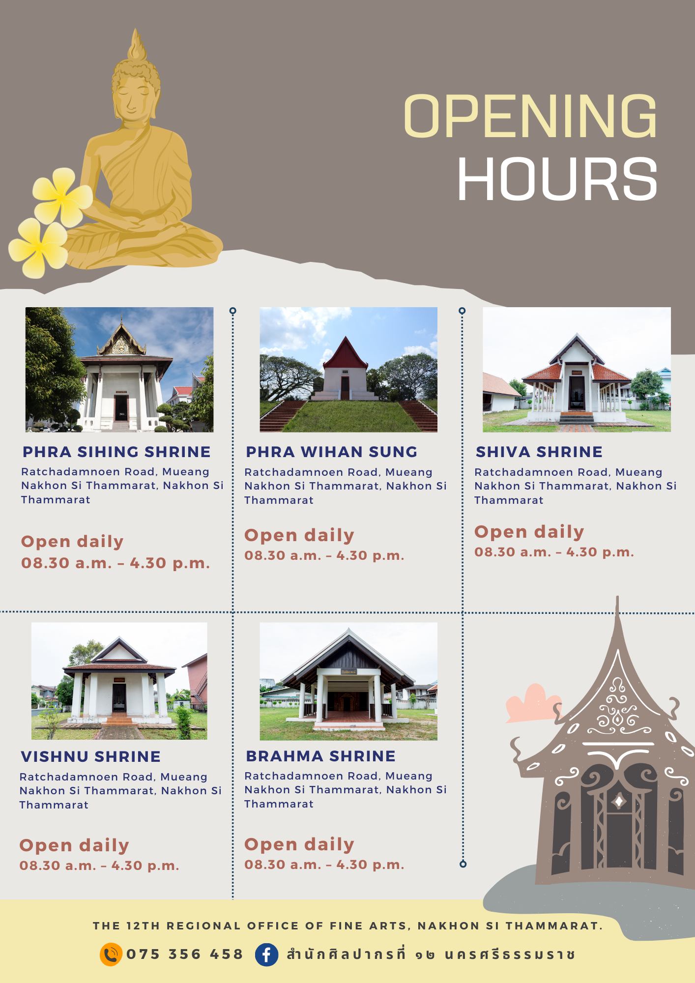 สำนักศิลปากรที่ ๑๒ นครศรีธรรมราช แจ้งข่าวประชาสัมพันธ์เวลาเปิด - ปิดโบราณสถาน ประจำปี พ.ศ. ๒๕๖๘ ได้แก่ หอพระสิหิงค์ หอพระสูง หอพระอิศวร หอพระนารายณ์ และโบสถ์พราหมณ์ อำเภอเมืองฯ จังหวัดนครศรีธรรมราช เปิดทุกวันไม่เว้นวันหยุดราชการ และวันหยุดนักขัตฤกษ์ วันจันทร์ - อาทิตย์ เวลา ๐๘.๓๐ - ๑๖.๐๐ น. สอบถามรายละเอียดเพิ่มเติมได้ทางกล่องข้อความ facebook สำนักศิลปากรที่ ๑๒ นครศรีธรรมราช หรือ โทร. ๐ ๗๕๓๕ ๖๔๕๘