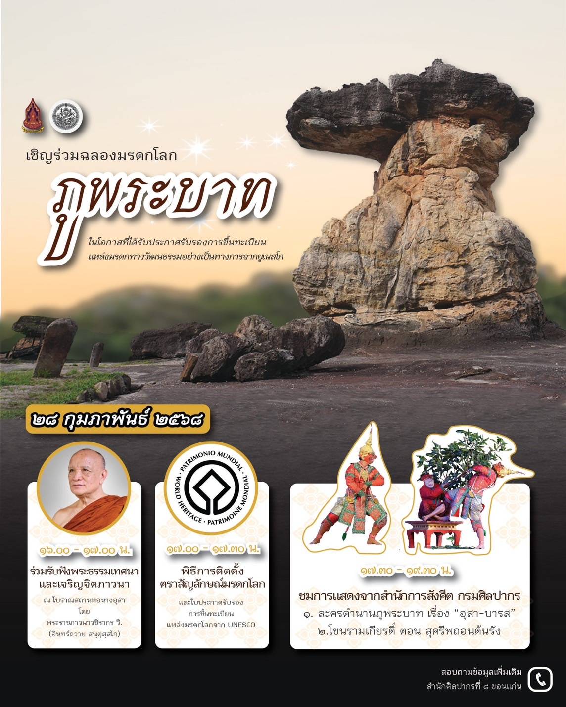 รมว.วธ. กล่าวอีกว่า อยากเชิญชวนคนไทยร่วมเฉลิมฉลองมรดกโลกภูพระบาทอย่างเป็นทางการในวันที่ 28 กุมภาพันธ์ 2568 ตั้งแต่เวลา 16.00 น.เป็นต้นไป กระทรวงวัฒนธรรม โดยกรมศิลปากร บูรณาการร่วมกับกรมการศาสนา ร่วมจัดกิจกรรมและจัดพิธีเฉลิมฉลองมรดกโลกภูพระบาทในโอกาสที่ได้รับประกาศรับรองการขึ้นทะเบียนแหล่งมรดกทางวัฒนธรรมอย่างเป็นทางการจากยูเนสโก โดยภายในงานมีกิจกรรมต่างๆ อาทิ การแสดงศิลปะพื้นบ้านจากชุมชนไทพวนอำเภอบ้านผือ กิจกรรมปลูกต้นไม้เฉลิมพระเกียรติ (ต้นรวงผึ้ง) และการติดตั้งตราสัญลักษณ์มรดกโลกและใบประกาศรับรองการขึ้นทะเบียนแหล่งมรดกโลกจากยูเนสโกอย่างเป็นทางการและติดตั้งป้ายรณรงค์ส่งเสริมการท่องเที่ยวมรดกโลกภูพระบาท ภายในพื้นที่โบราณสถานอุทยานประวัติศาสตร์ภูพระบาท ขณะที่กรมการศาสนา จัดธรรมเทศนาและเจริญจิตภาวนา ณ โบราณสถานหอนางอุสา นำพิธีโดย พระราชภาวนาวชิรากร วิ. (อินทร์ถวาย สนฺตุสฺสโก) วัดอุดมมงคลวนาราม (วัดป่านาคำน้อย) อำเภอนายูง จังหวัดอุดรธานี ที่สำคัญสำนักการสังคีต กรมศิลปากร จัดแสดงละครตำนานภูพระบาท เรื่อง "อุสา - บารส" และโขนเรื่องรามเกียรติ์ ตอน สุครีพถอนต้นรัง อีกด้วย