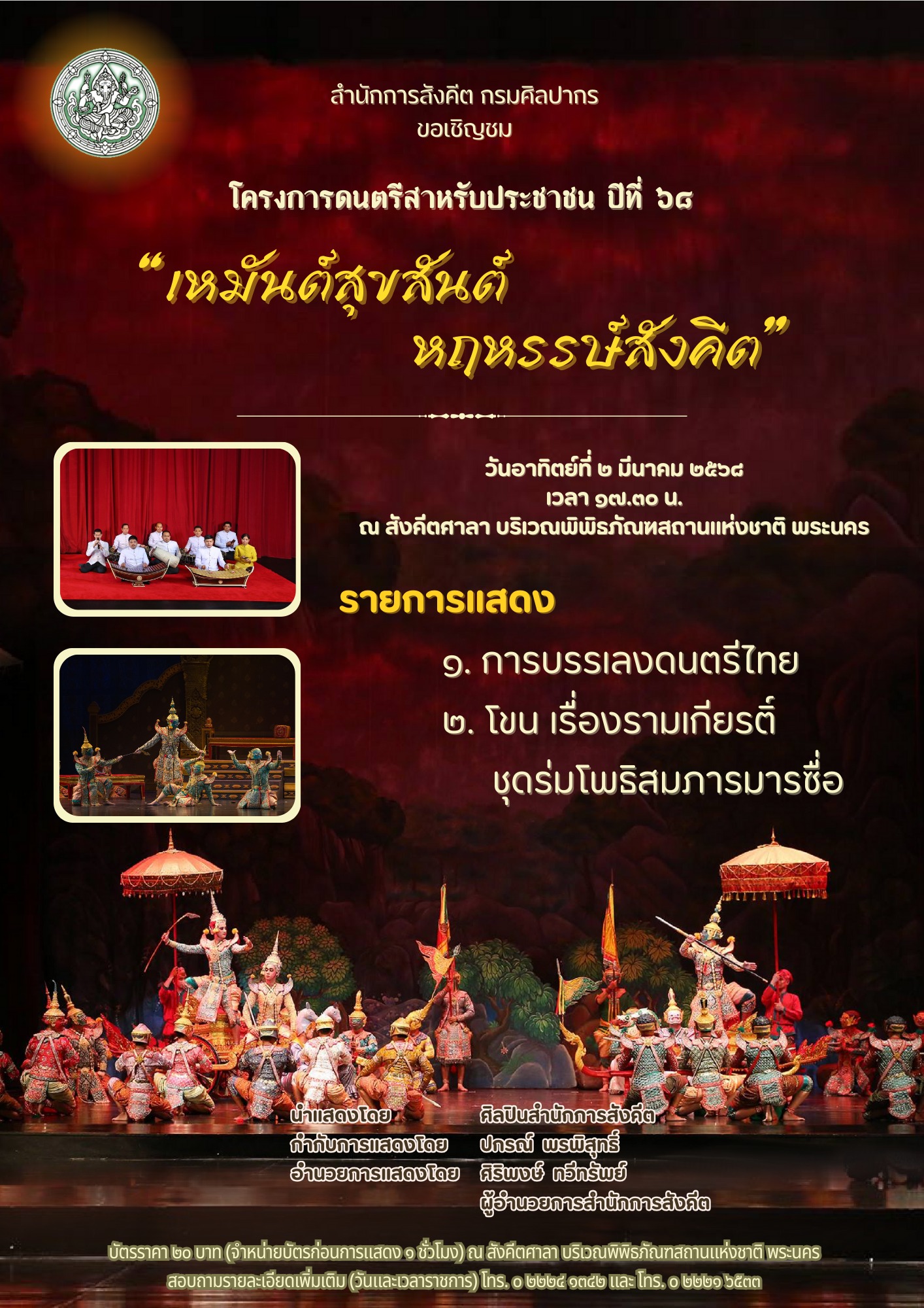 สำนักการสังคีต กรมศิลปากร ขอเชิญชมโครงการดนตรีสำหรับประชาชน ปีที่ ๖๘ “เหมันต์สุขสันต์ หฤหรรษ์สังคีต” วันอาทิตย์ที่ ๒ มีนาคม ๒๕๖๘ เวลา ๑๗.๓๐ น. ณ สังคีตศาลา บริเวณพิพิธภัณฑสถานแห่งชาติ พระนคร พบกับรายการแสดง ๑. การบรรเลงดนตรีไทย ๒. โขน เรื่องรามเกียรติ์ ชุดร่มโพธิสมภารมารซื่อ นำแสดงโดย ศิลปินสำนักการสังคีต, กำกับการแสดงโดย ปกรณ์ พรพิสุทธิ์, อำนวยการแสดงโดย ศิริพงษ์ ทวีทรัพย์ ผู้อำนวยการสำนักการสังคีต บัตรราคา ๒๐ บาท (จำหน่ายบัตรก่อนการแสดง ๑ ชั่วโมง) ณ สังคีตศาลา บริเวณพิพิธภัณฑสถานแห่งชาติ พระนคร สอบถามรายละเอียดเพิ่มเติม (วันและเวลาราชการ) โทร. ๐ ๒๒๒๔ ๑๓๔๒ และ โทร. ๐ ๒๒๒๑ ๖๕๓๓