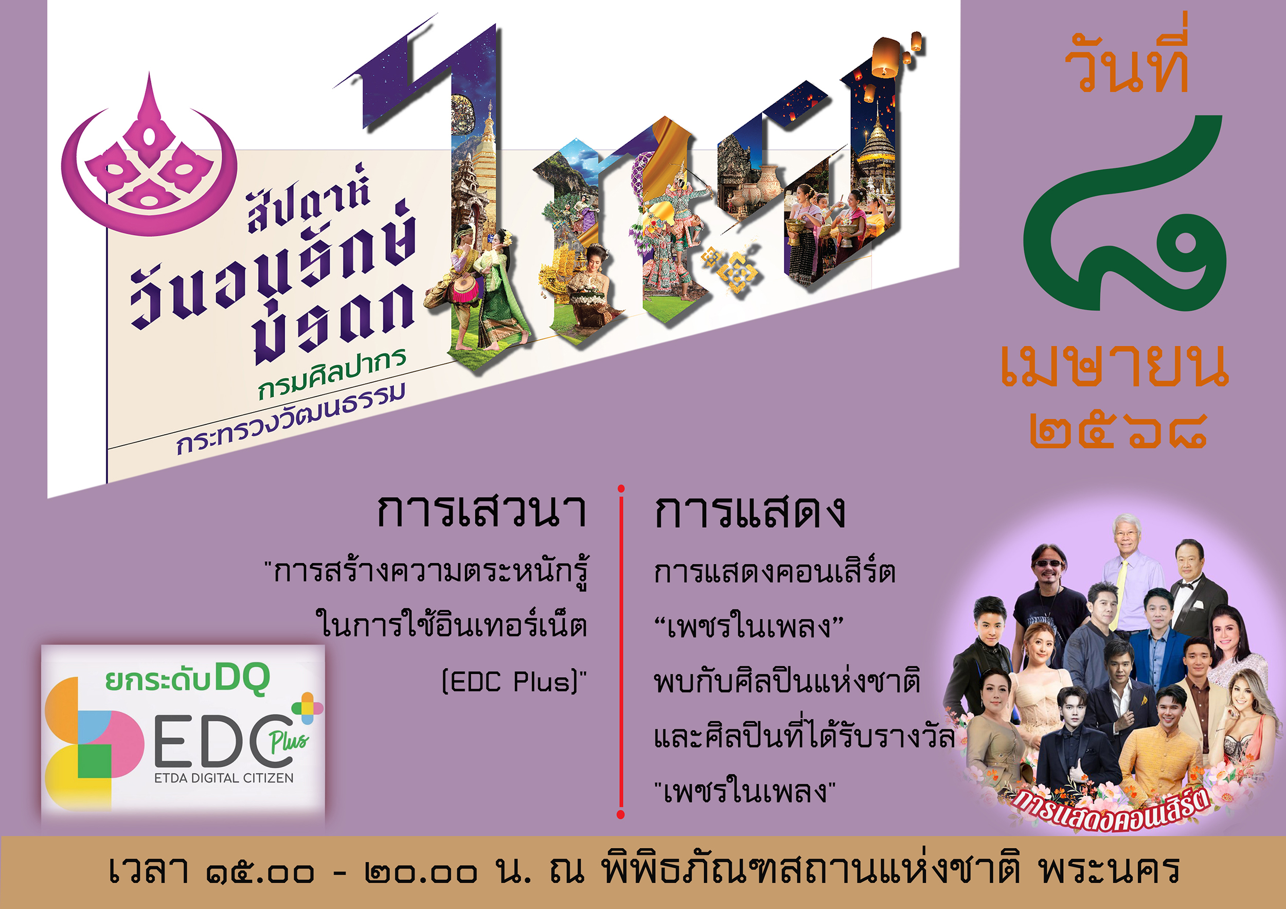 วันสุดท้ายของการจัดกิจกรรม วันอังคารที่ ๘ เมษายน ๒๕๖๘ เวลา ๑๕.๐๐ น. ขอเชิญชวนผู้สนใจร่วมรับฟังการเสวนา เรื่อง "การสร้างความตระหนักรู้ในการใช้อินเทอร์เน็ต (EDC Plus)" โดยวิทยากร ๒ ท่าน ได้แก่ นางวัญญา ประคำทอง ผู้อำนวยการศูนย์เทคโนโลยีสารสนเทศมรดกศิลปวัฒนธรรม และ นายกริช ขาวอุปถัมภ์ หัวหน้าทีม ETDA Digital Citizen สำนักงานพัฒนาธุรกรรมทางอิเล็กทรอนิกส์ ผู้ดำเนินรายการโดย นางวิรยาร์ ชำนาญพล ผู้อำนวยการกลุ่มระบบสารสนเทศมรดกศิลปวัฒนธรรม ทั้งนี้ สามารถรับชมการถ่ายทอดสด ผ่าน Facebook live : กรมศิลปากร กระทรวงวัฒนธรรม หรือ กลุ่มเผยแพร่ฯ กรมศิลปากร