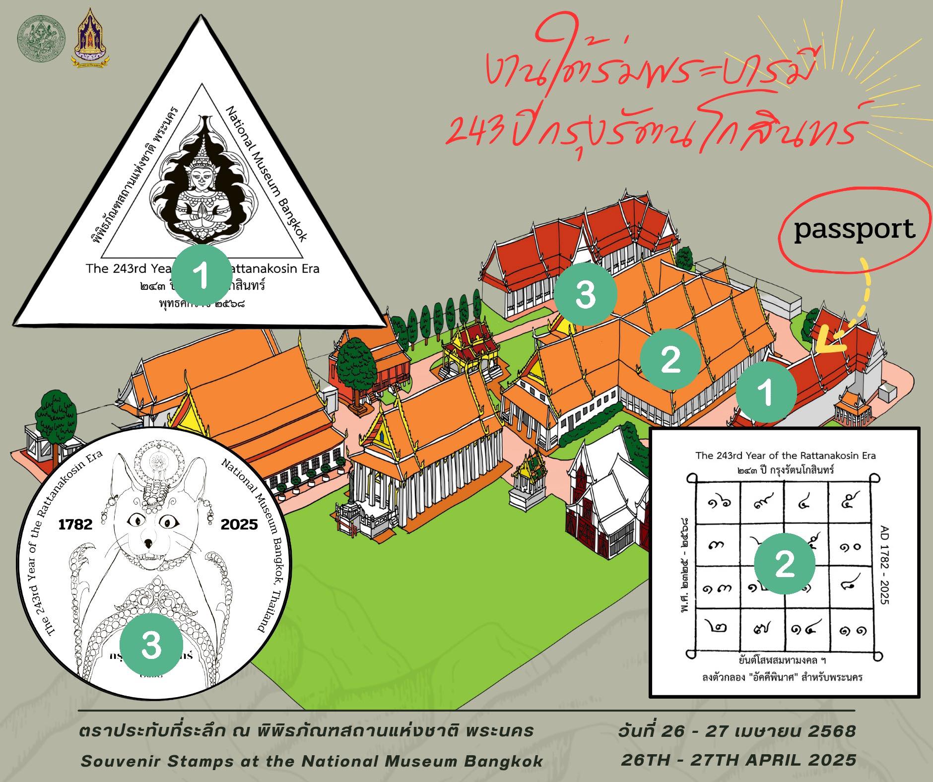 พิพิธภัณฑสถานแห่งชาติ พระนคร ขอเชิญร่วมกิจกรรมตราประทับที่ระลึก (Souvenir Stamps) เนื่องในงานใต้ร่มพระบารมี ๒๔๓ ปี กรุงรัตนโกสินทร์ โดยมีตราประทับ ๓ แบบ ดังนี้