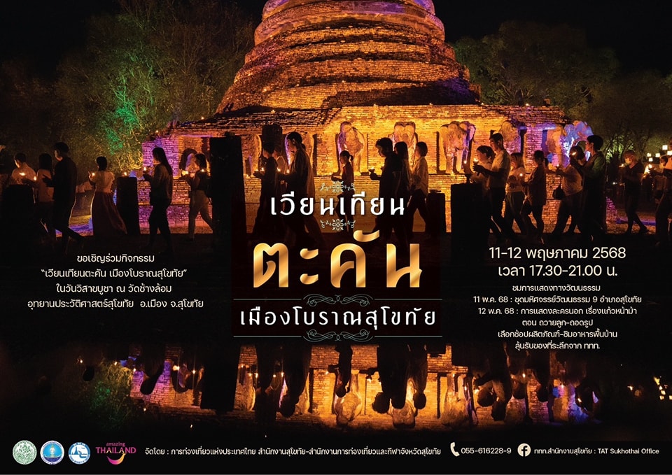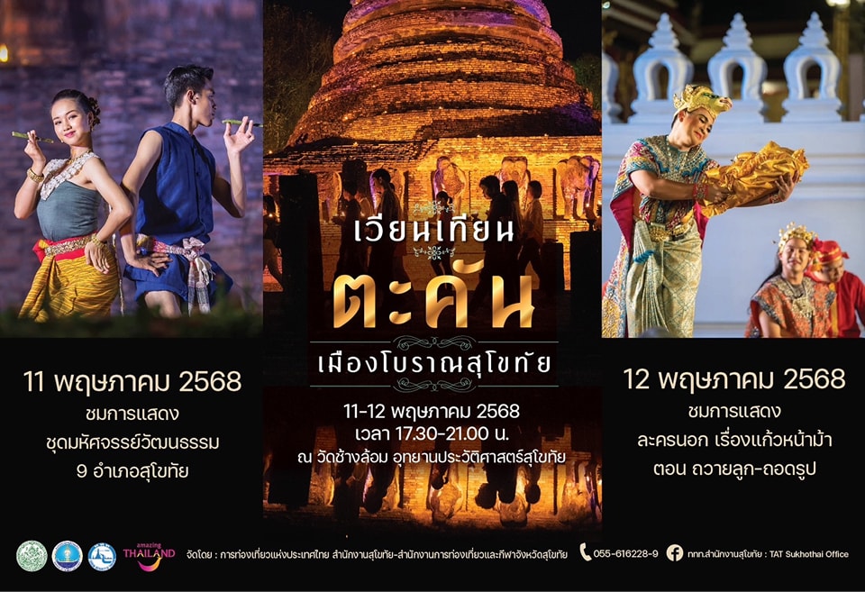 อุทยานประวัติศาสตร์สุโขทัย ชวนกางปฏิทินวางแผนเที่ยวช่วงวันหยุดยาว วันที่ 10-11-12 พฤษภาคม 2568 ขอเชิญไปท่องเที่ยวจังหวัดสุโขทัย ในวันที่ 10 พฤษภาคม 2568 ชมการแสดงมินิไลท์แอนด์ซาวน์ เวลา 19.00 น. ณ วัดสระศรี อุทยานประวัติศาสตร์สุโขทัย ชมฟรี!! และวันที่ 11 - 12 พฤษภาคม 2568 ขอเชิญร่วมกิจกรรม “เวียนเทียนตะคัน เมืองโบราณสุโขทัย” เนื่องในวันวิสาขบูชา ณ วัดช้างล้อม อุทยานประวัติศาสตร์สุโขทัย (ด้านหลังโรงแรมเดอะเลเจนด้าสุโขทัย) ตั้งแต่เวลา 17.30 น. - 21.00 น. กิจกรรมภายในงาน ประกอบด้วย