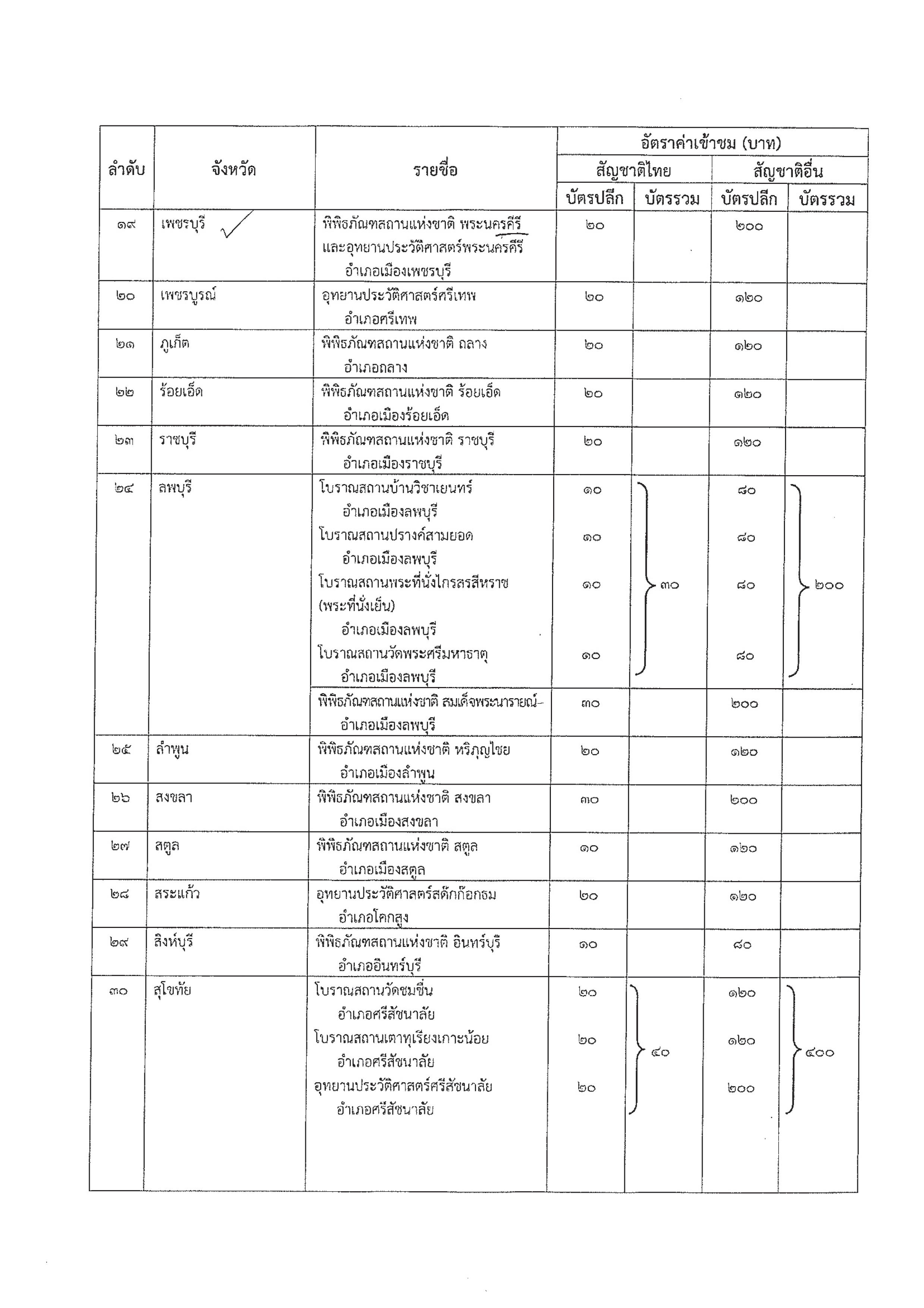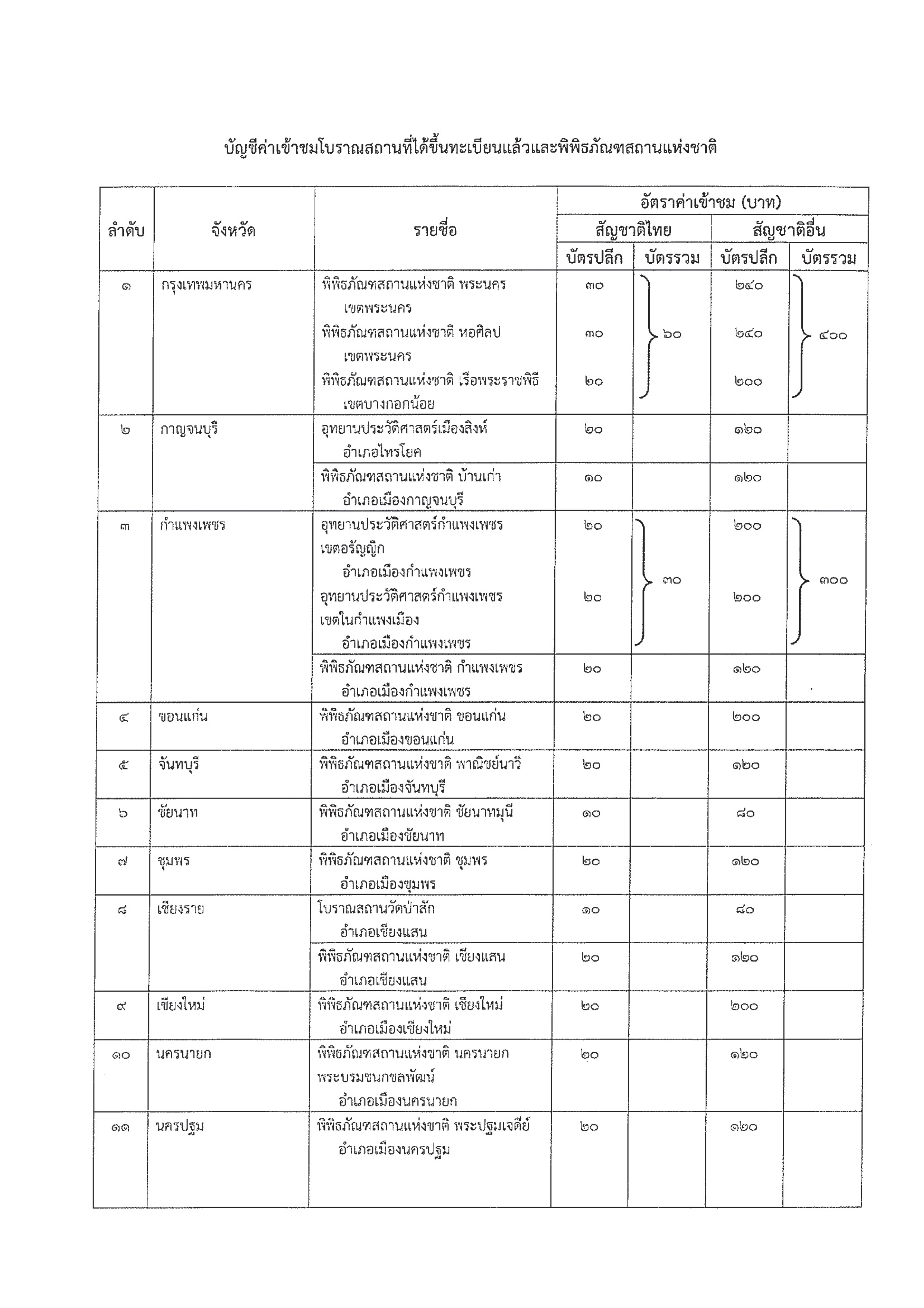 หมายเหตุ : เหตุผลในการประกาศใช้กฎกระทรวงฉบับนี้ คือ โดยที่อัตราค่าเข้าชมโบราณสถานที่ได้ขึ้นทะเบียนแล้วและพิพิธภัณฑสถานแห่งชาติตามบัญชีท้ายกฎกระทรวงกำหนดค่าเข้าชมและค่าบริการอื่นสำหรับโบราณสถานที่ได้ขึ้นทะเบียนแล้วและพิพิธภัณฑสถานแห่งชาติ พ.ศ. ๒๕๕๑ ได้ใช้บังคับมาเป็นเวลานานแล้ว