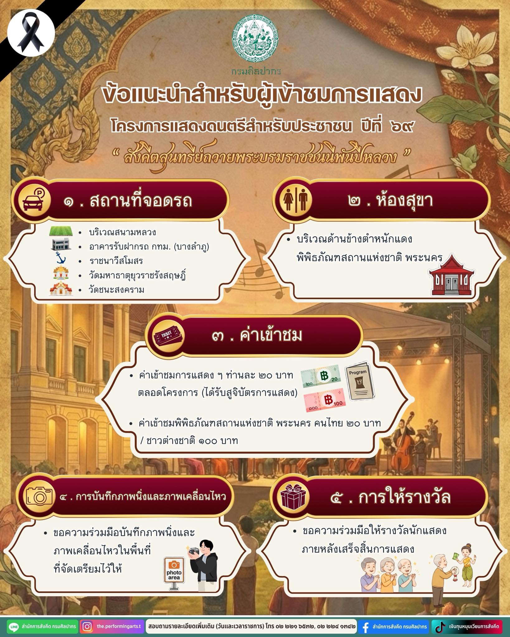ขอเชิญชวนผู้สนใจชมการแสดงโครงการดนตรีสำหรับประชาชน ปีที่ ๖๙ “สังคีตสุนทรีย์ถวายพระบรมราชชนนีพันปีหลวง” ทุกวันอาทิตย์ ระหว่างวันอาทิตย์ที่ ๑ กุมภาพันธ์ ๒๕๖๙ ถึงวันอาทิตย์ที่ ๑๕ มีนาคม ๒๕๖๙ และการแสดงสมโภชพระพุทธสิหิงค์ ในวันจันทร์ที่ ๒ กุมภาพันธ์ ๒๕๖๙ เวลา ๑๗.๓๐ น. ณ เวทีสังคีตศาลา บริเวณพิพิธภัณฑสถานแห่งชาติ พระนคร