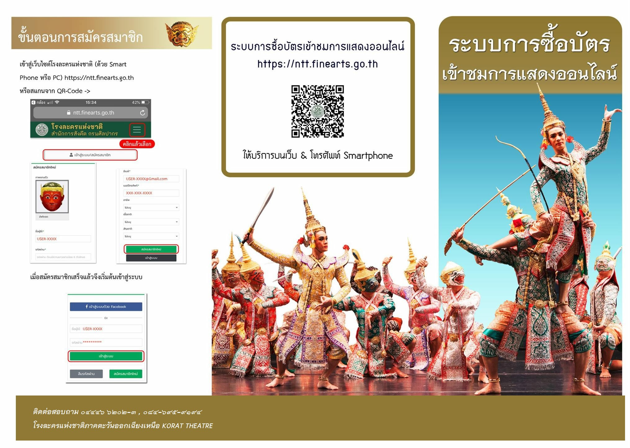 ทั้งนี้ ผู้สนใจซื้อบัตรเข้าชมการแสดง สามารถสมัครสมาชิกเข้าใช้ระบบซื้อบัตรเข้าชมการแสดงออนไลน์ ได้ที่ https://ntt.finearts.go.th ให้บริการบนเว็บไซต์ และโทรศัพท์ Smartphone เมื่อสมัครสมาชิกเรียบร้อยแล้ว มีขั้นตอนการซื้อ ดังนี้
