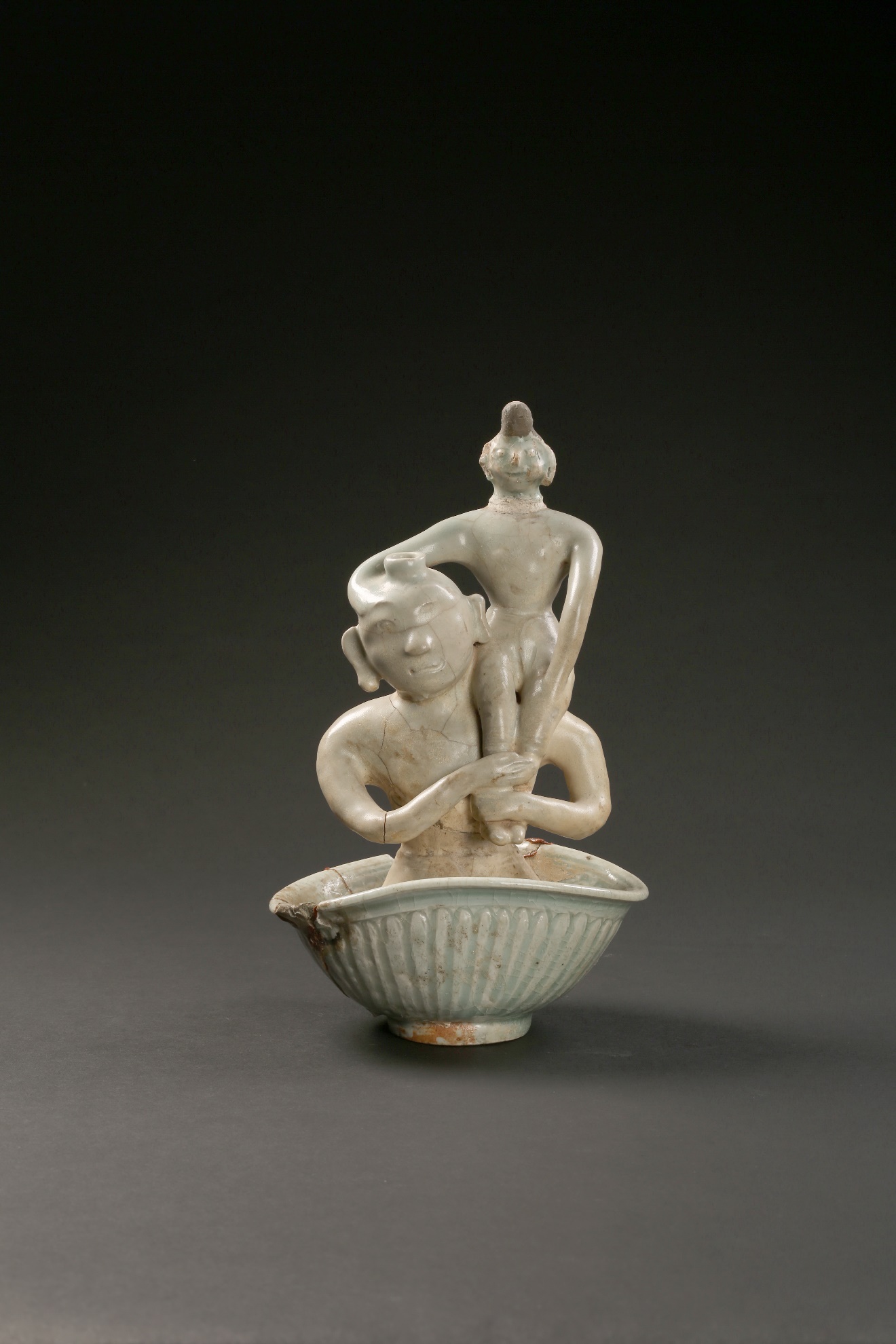 สังคโลกรูปบุคคลนั่งแบกเด็กไว้บนบ่าซ้ายติดอยู่กับชามลายกลีบดอกไม้ เคลือบสีเขียวอ่อน บริเวณบนศีรษะรูปบุคคลมีลักษณะเป็นรู อาจใช้สำหรับใส่ของเหลว ซึ่งการที่รูปคนอุ้มเด็กติดอยู่ภายในชาม คงเกิดจากความผิดพลาดระหว่างกรรมวิธีการเผา