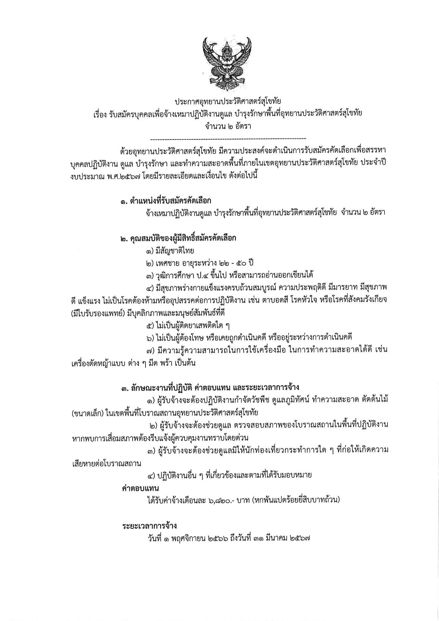 ประกาศอุทยานประวัติศาสตร์สุโขทัย เรื่อง รับสมัครบุคคลเพื่อจ้างเหมาปฏิบัติงานดูแล บำรุงรักษาพื้นที่อุทยานประวัติศาสตร์สุโขทัย จำนวน ๒ อัตรา