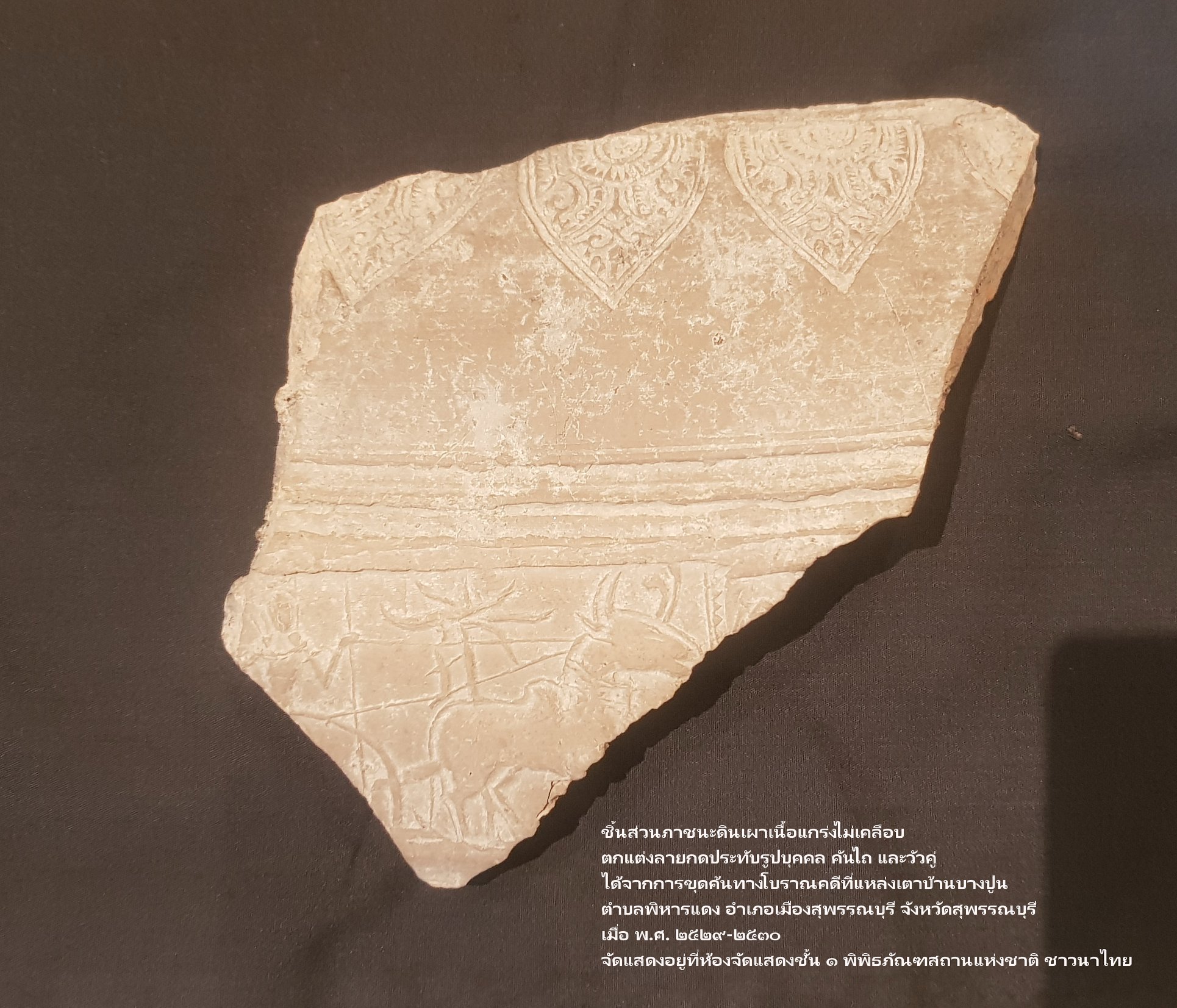 ชิ้นส่วนภาชนะตกแต่งลายกดประทับรูปบุคคล คันไถ และวัวคู่ อาจหมายถึงพิธีแรกนาขวัญ อันแสดงให้เห็นถึงความสำคัญของพิธีกรรมก่อนการเพาะปลูกข้าวตั้งแต่สมัยอดีตของไทย ซึ่งมีปรากฏลวดลายกดประทับบนภาชนะดินเผาในสมัยอยุธยา จากแหล่งเตาบ้านบางปูนจังหวัดสุพรรณบุรี ยังหมายรวมถึงการให้ความสำคัญของการเพาะปลูกข้าวในพื้นที่จังหวัดสุพรรณบุรีด้วย