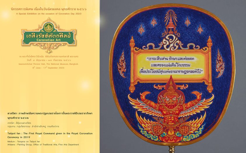 ผลงานศิลปกรรมออกแบบและจัดสร้างโดย กลุ่มจิตรกรรม สำนักช่างสิบหมู่ กรมศิลปากร จัดแสดงในนิทรรศการพิเศษ “เถลิงรัชช์หัตถศิลป์” ณ พระที่นั่งอิศราวินิจฉัย พิพิธภัณฑสถานแห่งชาติ พระนคร ระหว่างวันที่ ๙ มิถุนายน – ๑๗ กันยายน ๒๕๖๖ เวลา ๐๙.๐๐ – ๑๖.๐๐ น. วันพุธ – วันอาทิตย์ (ปิดวันจันทร์ – วันอังคาร)