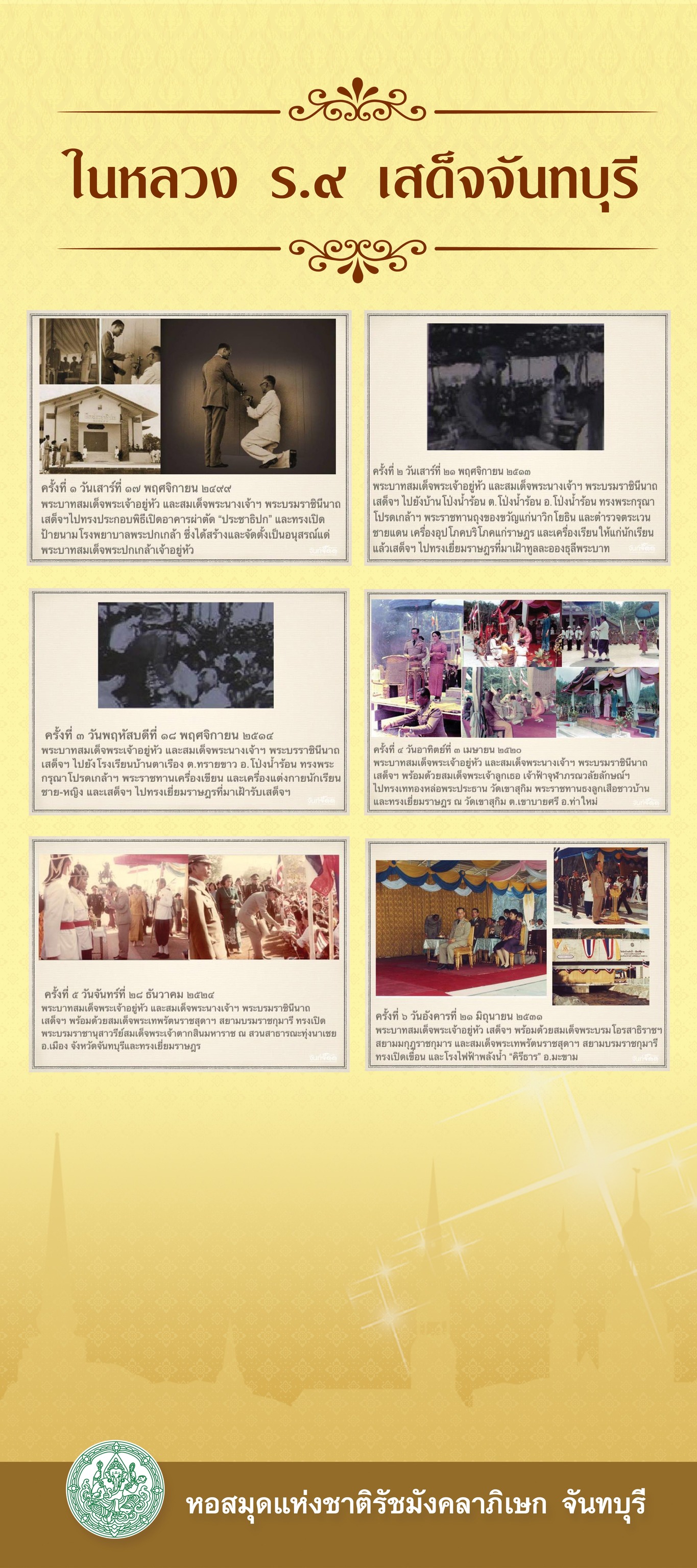 ขอเชิญชมนิทรรศการเฉลิมพระเกียรติ "น้อมรำลึกในหลวง ร.๙ ธ สถิตในดวงใจ ไทยนิรันดร์" เนื่องในวันนวมินทรมหาราช (วันคล้ายวันสวรรคต) 13 ตุลาคม 2566 เพื่อน้อมรำลึกในพระมหากรุณาธิคุณ พระบาทสมเด็จพระบรมชนกาธิเบศร มหาภูมิพลอดุลยเดชมหาราช บรมนาถบพิตร กษัตริย์นักพัฒนา พระผู้สร้างคลองภักดีรำไพ พระมหากรุณาธิคุณต่อชาวจันทบุรี ในการป้องกันอุทกภัย และเสด็จเยี่ยมราษฏรจันทบุรี 6 ครั้ง