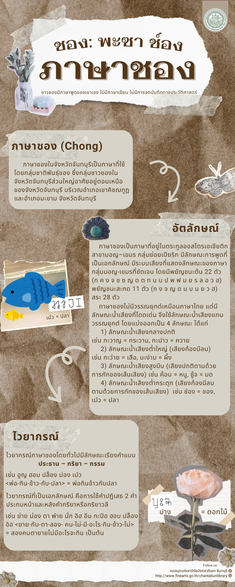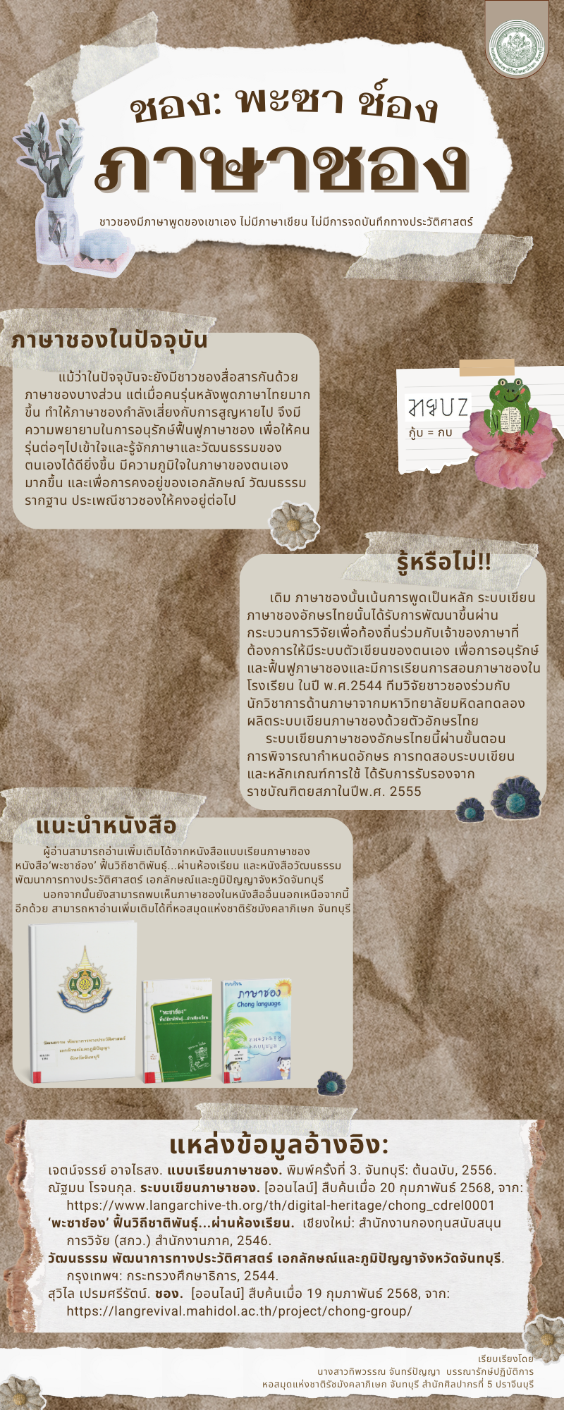 ณัฐมน โรจนกุล. ระบบเขียนภาษาชอง. [ออนไลน์] สืบค้นเมื่อ 20 กุมภาพันธ์ 2568, จาก: