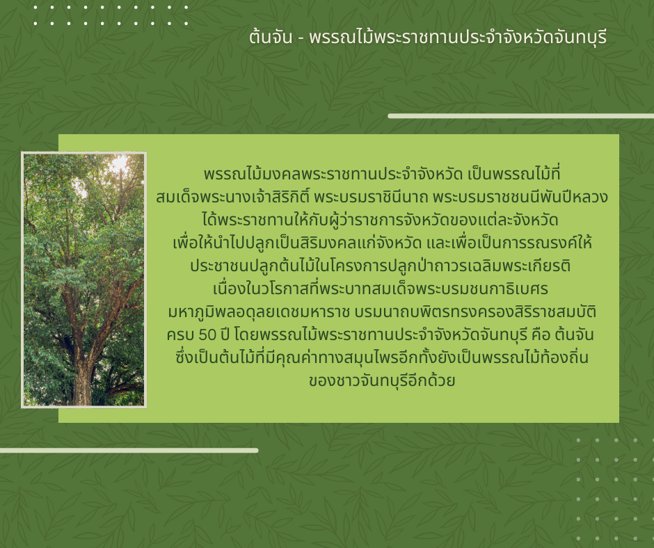 พรรณไม้มงคลพระราชทานประจำจังหวัด เป็นพรรณไม้ที่สมเด็จพระนางเจ้าสิริกิติ์ พระบรมราชินีนาถ พระบรมราชชนนีพันปีหลวงได้พระราชทานให้กับผู้ว่าราชการจังหวัดของแต่ละจังหวัด เพื่อให้นำไปปลูกเป็นสิริมงคลแก่จังหวัดและเพื่อเป็นการรณรงค์ให้ประชาชนปลูกต้นไม้ในโครงการปลูกป่าถาวรเฉลิมพระเกียรติ เนื่องในวโรกาสที่พระบาทสมเด็จพระบรมชนกาธิเบศร มหาภูมิพลอดุลยเดชมหาราช บรมนาถบพิตรทรงครองสิริราชสมบัติครบ 50 ปี โดยพรรณไม้พระราชทานประจำจังหวัดจันทบุรี คือ ต้นจัน ซึ่งเป็นต้นไม้ที่มีคุณค่าทางสมุนไพร อีกทั้งยังเป็นพรรณไม้ท้องถิ่นของชาวจันทบุรีอีกด้วย