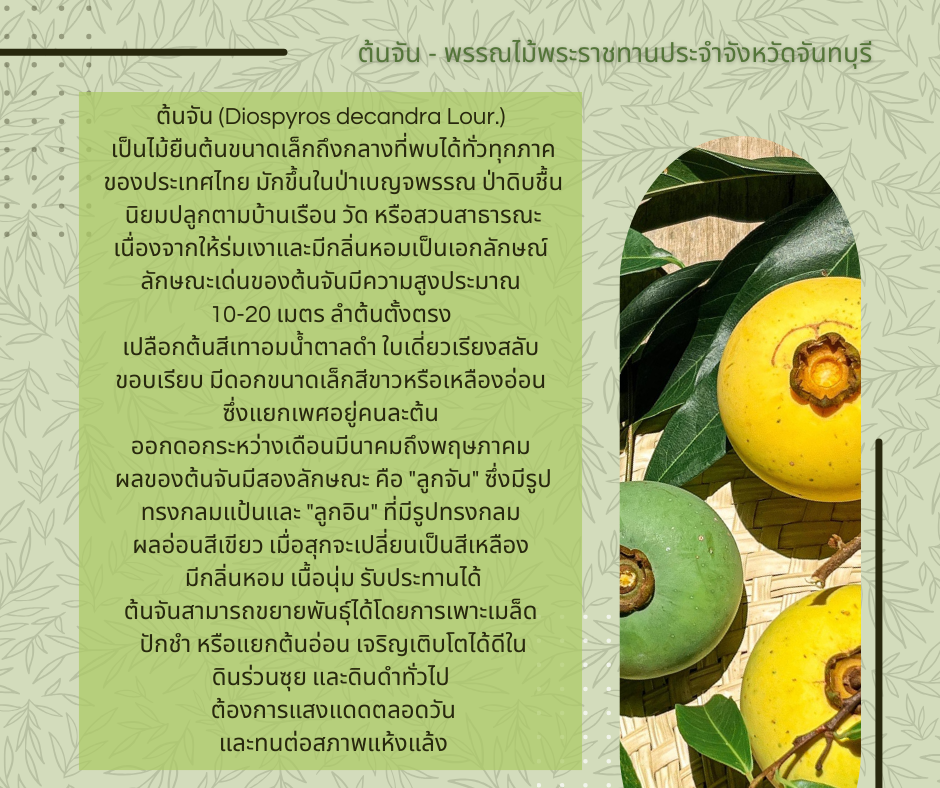 ต้นจัน (Diospyros decandra Lour.) เป็นไม้ยืนต้นขนาดเล็กถึงกลางที่พบได้ทั่วทุกภาคของประเทศไทย มักขึ้นในป่าเบญจพรรณ ป่าดิบชื้น นิยมปลูกตามบ้านเรือน วัด หรือสวนสาธารณะ เนื่องจากให้ร่มเงาและมีกลิ่นหอมเป็นเอกลักษณ์ ลักษณะเด่นของต้นจันมีความสูงประมาณ 10-20 เมตร ลำต้นตั้งตรง เปลือกต้นสีเทาอมน้ำตาลดำ ใบเดี่ยวเรียงสลับ ขอบเรียบ มีดอกขนาดเล็กสีขาวหรือเหลืองอ่อน ซึ่งแยกเพศอยู่คนละต้น ออกดอกระหว่างเดือนมีนาคมถึงพฤษภาคม ผลของต้นจันมีสองลักษณะ คือ "ลูกจัน" ซึ่งมีรูปทรงกลมแป้น และ "ลูกอิน" ที่มีรูปทรงกลม ผลอ่อนสีเขียว เมื่อสุกจะเปลี่ยนเป็นสีเหลือง มีกลิ่นหอม เนื้อนุ่ม รับประทานได้ ต้นจันสามารถขยายพันธุ์ได้โดยการเพาะเมล็ด ปักชำ หรือแยกต้นอ่อน เจริญเติบโตได้ดีในดินร่วนซุยและดินดำทั่วไป ต้องการแสงแดดตลอดวันและทนต่อสภาพแห้งแล้ง