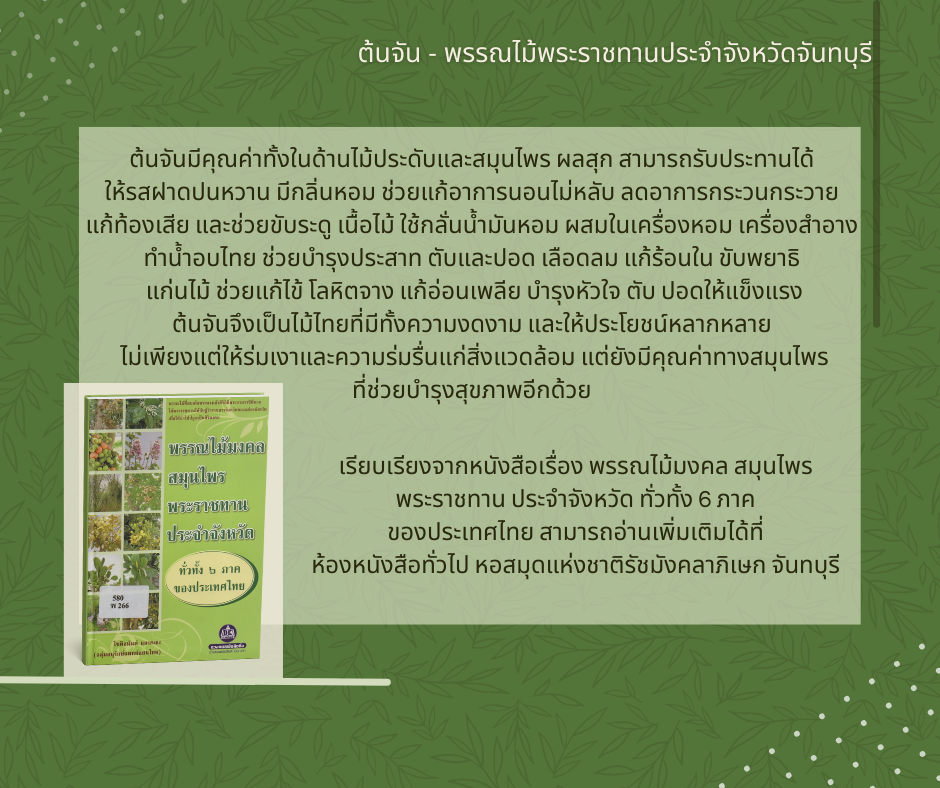 เรียบเรียงจากหนังสือเรื่อง พรรณไม้มงคล สมุนไพรพระราชทาน ประจำจังหวัด ทั่วทั้ง 6 ภาคของประเทศไทย สามารถอ่านเพิ่มเติมได้ที่ห้องหนังสือทั่วไป หอสมุดแห่งชาติรัชมังคลาภิเษก จันทบุรี