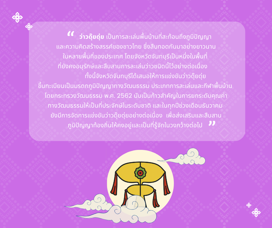 ว่าวดุ๊ยดุ่ย เป็นการละเล่นพื้นบ้านที่สะท้อนถึงภูมิปัญญาและความคิดสร้างสรรค์ของชาวไทย ซึ่งสืบทอดกันมาอย่างยาวนานในหลายพื้นที่ของประเทศ โดยจังหวัดจันทบุรีเป็นหนึ่งในพื้นที่ที่ยังคงอนุรักษ์และสืบสานการละเล่นว่าวชนิดนี้ไว้อย่างต่อเนื่อง ทั้งนี้จังหวัดจันทบุรีได้เสนอให้การแข่งขันว่าวดุ๊ยดุ่ยขึ้นทะเบียนเป็นมรดกภูมิปัญญาทางวัฒนธรรม ประเภทการละเล่นและกีฬาพื้นบ้าน โดยกระทรวงวัฒนธรรม พ.ศ. 2562 ซึ่งนับเป็นก้าวสำคัญในการยกระดับคุณค่าทางวัฒนธรรมให้เป็นที่ประจักษ์ในระดับชาติ และในทุกปีช่วงเดือนธันวาคม ยังมีการจัดการแข่งขันว่าวดุ๊ยดุ่ยอย่างต่อเนื่อง เพื่อส่งเสริมและสืบสานภูมิปัญญาท้องถิ่นให้คงอยู่และเป็นที่รู้จักในวงกว้างต่อไป