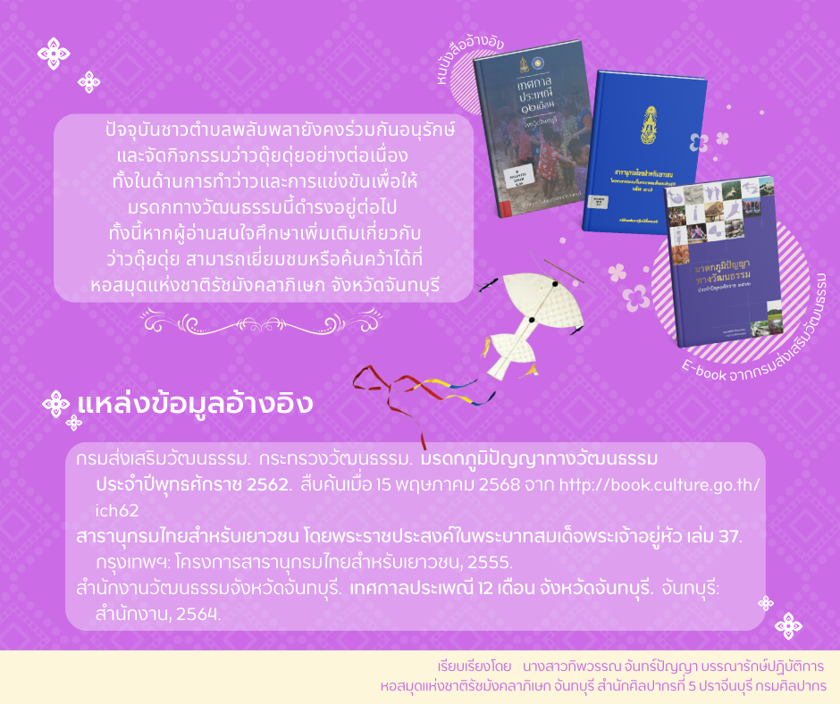 สำนักงานวัฒนธรรมจังหวัดจันทบุรี. เทศกาลประเพณี 12 เดือน จังหวัดจันทบุรี. จันทบุรี: สำนักงาน,