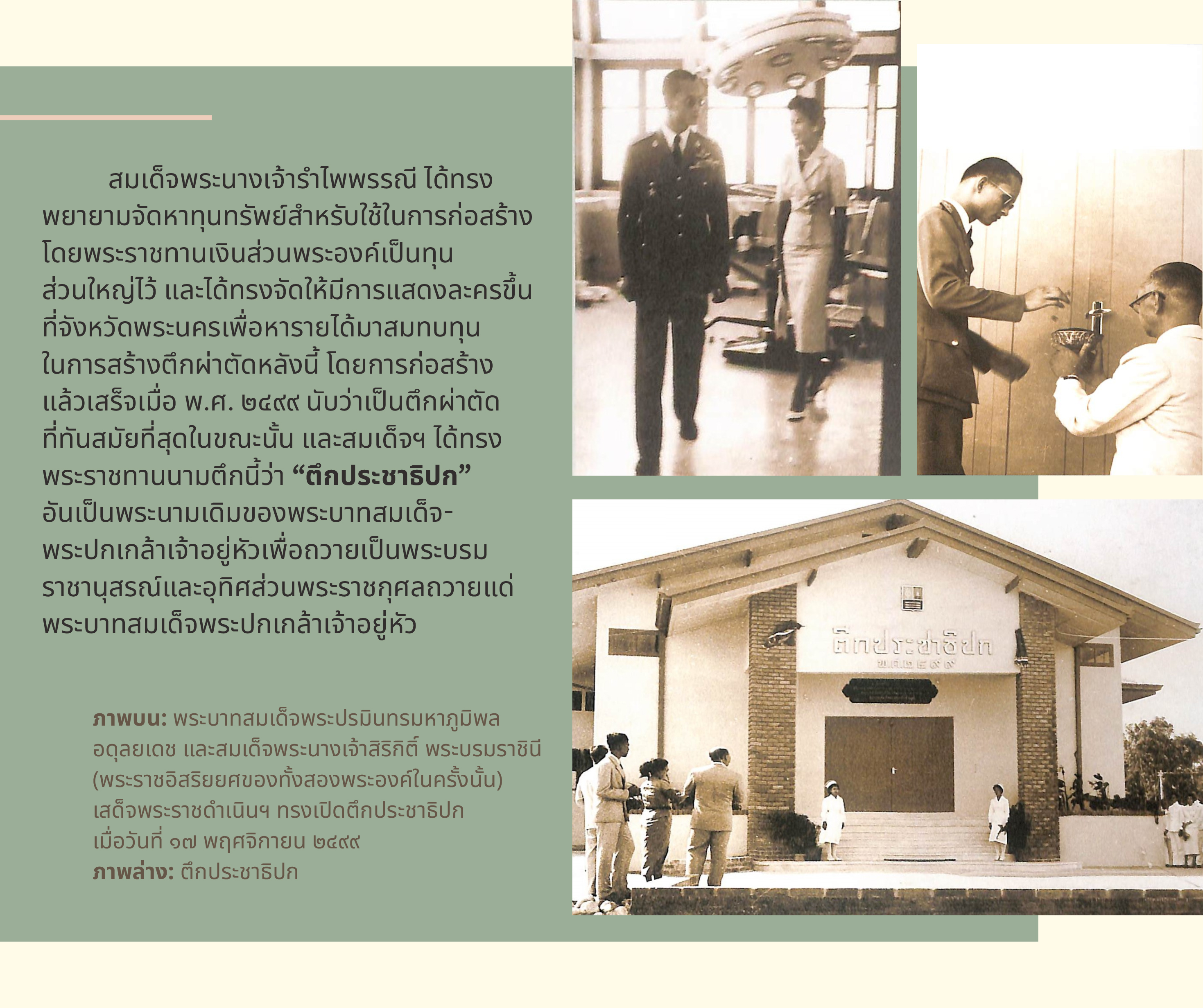 สมเด็จพระนางเจ้ารำไพพรรณี ได้ทรงพยายามจัดหาทุนทรัพย์สำหรับใช้ในการก่อสร้าง โดยพระราชทานเงินส่วนพระองค์เป็นทุนส่วนใหญ่ไว้ และได้ทรงจัดให้มีการแสดงละครขึ้นที่จังหวัดพระนครเพื่อหารายได้มาสมทบทุนในการสร้างตึกผ่าตัดหลังนี้ โดยการก่อสร้างแล้วเสร็จเมื่อ พ.ศ. ๒๔๙๙ นับว่าเป็นตึกผ่าตัดที่ทันสมัยที่สุดในขณะนั้น และสมเด็จฯ ได้ทรงพระราชทานนามตึกนี้ว่า “ตึกประชาธิปก” อันเป็นพระนามเดิมของพระบาทสมเด็จพระปกเกล้าเจ้าอยู่หัวเพื่อถวายเป็นพระบรมราชานุสรณ์และอุทิศส่วนพระราชกุศลถวายแด่พระบาทสมเด็จพระปกเกล้าเจ้าอยู่หัว