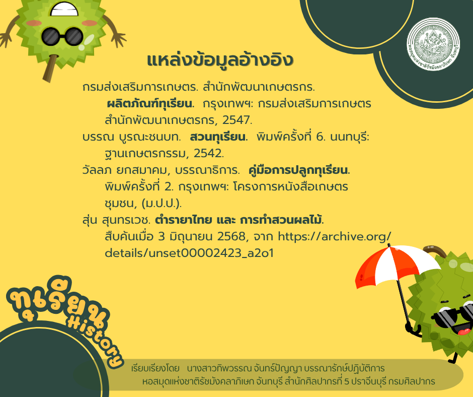 กรมส่งเสริมการเกษตร. สำนักพัฒนาเกษตรกร. ผลิตภัณฑ์ทุเรียน. กรุงเทพฯ: กรมส่งเสริมการเกษตร สำนักพัฒนาเกษตรกร, 2547.