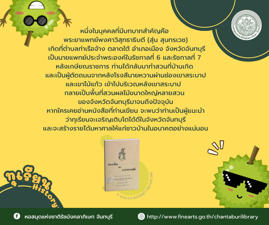 หนึ่งในบุคคลที่มีบทบาทสำคัญคือ พระยาแพทย์พงศาวิสุทธาธิบดี (สุ่น สุนทรเวช) เกิดที่ตำบลท่าเรือจ้าง ตลาดใต้ อำเภอเมือง จังหวัดจันทบุรี เป็นนายแพทย์ประจำพระองค์ในรัชกาลที่ 6 และรัชกาลที่ 7 หลังเกษียณราชการ ท่านได้กลับมาทำสวนที่บ้านเกิด และเป็นผู้ตัดถนนจากหลังโรงสีนายหวานผ่านช่องเขาสระบาป และเขาไม้แก้ว เข้าไปบริเวณหลังเขาสระบาป กลายเป็นพื้นที่สวนผลไม้ขนาดใหญ่หลายสวน ของจังหวัดจันทบุรีมาจนถึงปัจจุบัน หากใครเคยอ่านหนังสือที่ท่านเขียน จะพบว่าท่านเป็นผู้แนะนำว่าทุเรียนจะเจริญเติบโตได้ดีในจังหวัดจันทบุรี และจะสร้างรายได้มหาศาลให้แก่ชาวบ้านในอนาคตอย่างแน่นอน