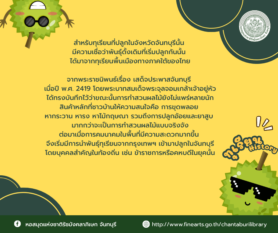 จากพระราชนิพนธ์เรื่อง เสด็จประพาสจันทบุรี เมื่อปี พ.ศ. 2419 โดยพระบาทสมเด็จพระจุลจอมเกล้าเจ้าอยู่หัว ได้ทรงบันทึกไว้ว่าขณะนั้น การทำสวนผลไม้ยังไม่แพร่หลายนัก สินค้าหลักที่ชาวบ้านให้ความสนใจคือ การขุดพลอย หากระวาน หารง หาไม้กฤษณา รวมถึงการปลูกอ้อยและยาสูบ มากกว่าจะเป็นการทำสวนผลไม้แบบจริงจัง ต่อมาเมื่อการคมนาคมในพื้นที่มีความสะดวกมากขึ้น จึงเริ่มมีการนำพันธุ์ทุเรียนจากกรุงเทพฯ เข้ามาปลูกในจันทบุรี โดยบุคคลสำคัญในท้องถิ่น เช่น ข้าราชการหรือคหบดีในยุคนั้น