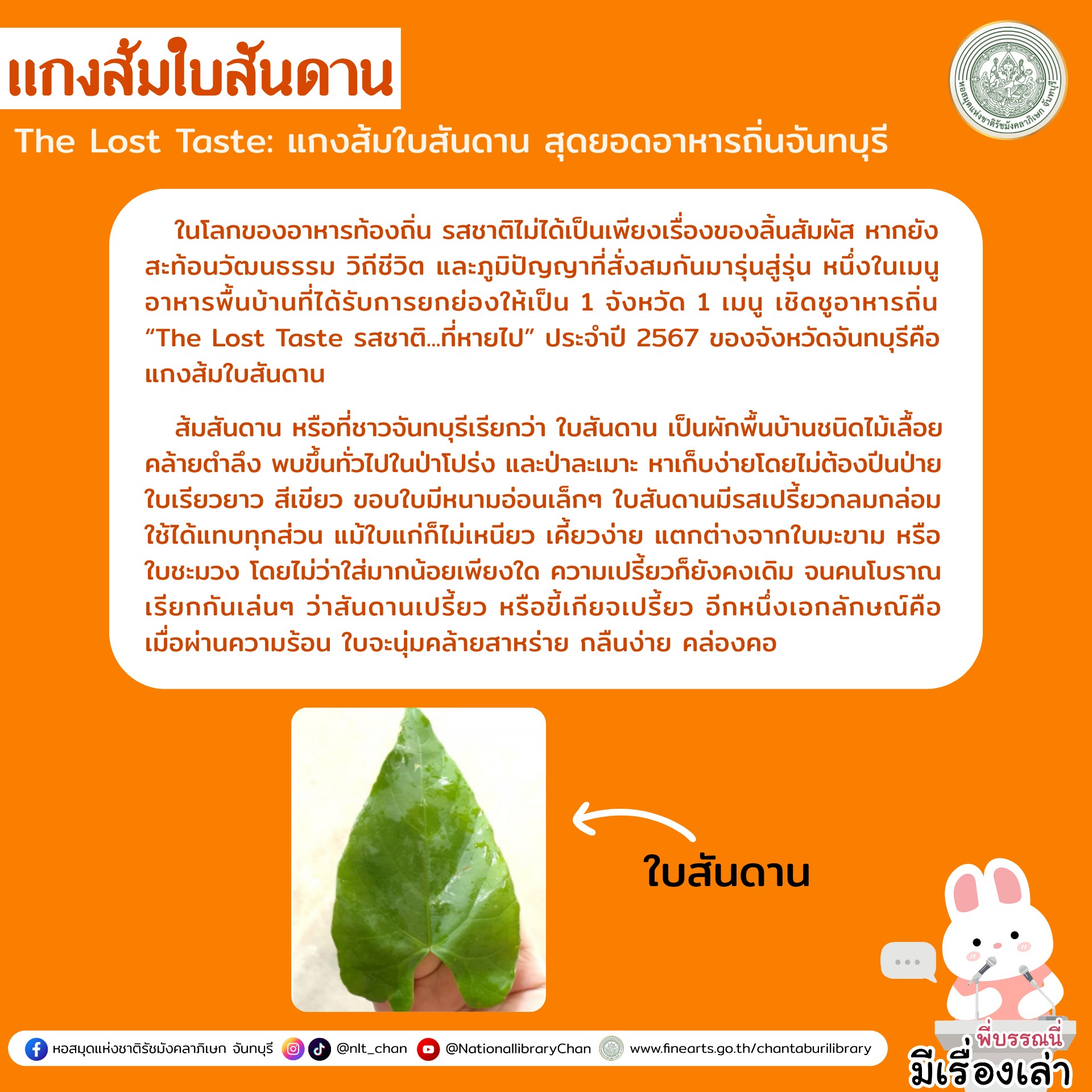 “รสชาติ... ที่หายไปจันทบุรี 1 จังหวัด 1 เมนู : แกงส้มใบสันดาน”. TOURIST & BUSINESS 1 ใน...ระยอง จันทบุรี. [2025], ฉบับพิเศษประจำปี 2568: 39. [ออนไลน์].