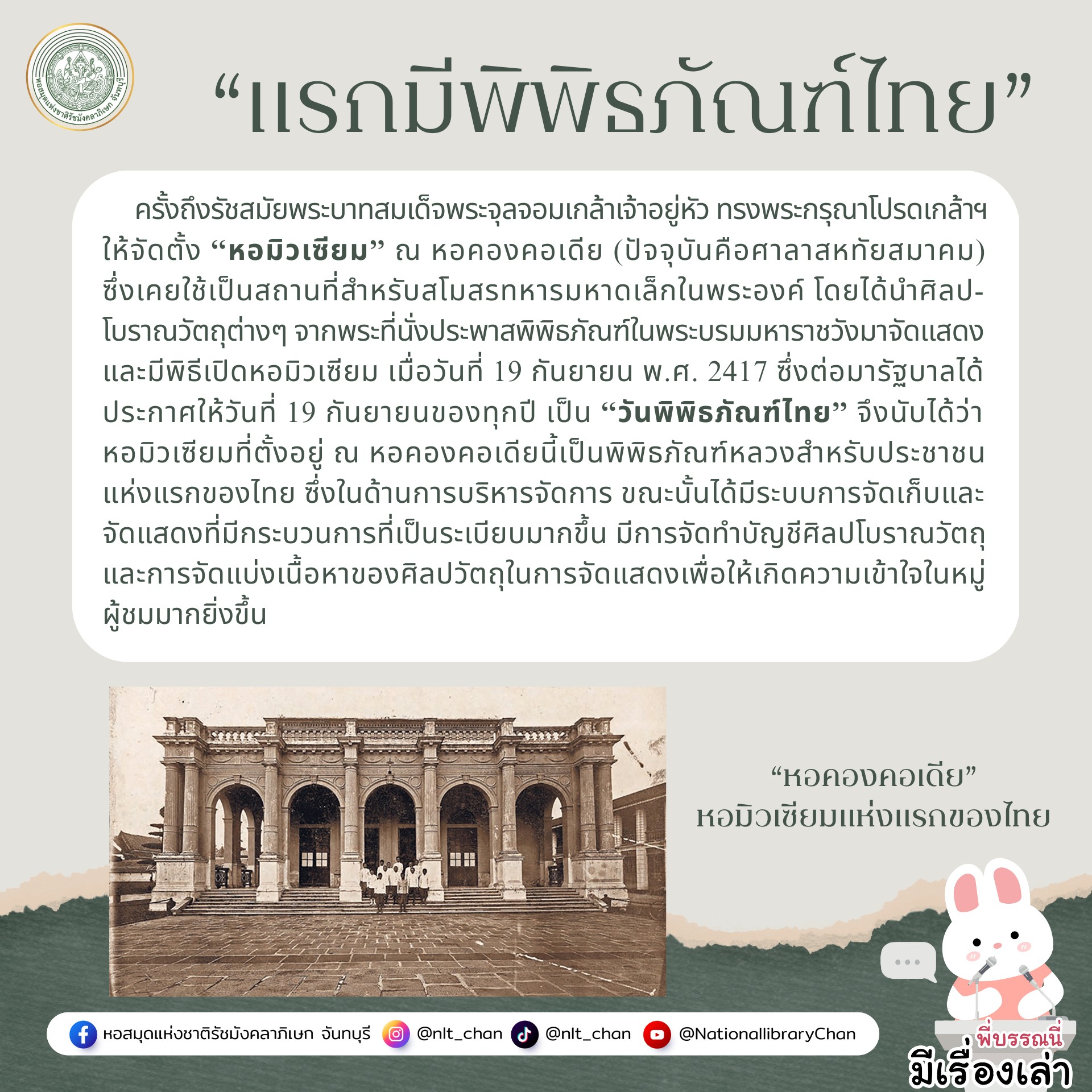 ครั้งถึงรัชสมัยพระบาทสมเด็จพระจุลจอมเกล้าเจ้าอยู่หัว ทรงพระกรุณาโปรดเกล้าฯ ให้จัดตั้ง “หอมิวเซียม”ณ หอคองคอเดีย (ปัจจุบันคือศาลาสหทัยสมาคม) ซึ่งเคยใช้เป็นสถานที่สำหรับสโมสรทหารมหาดเล็กในพระองค์ โดยได้นำศิลปโบราณวัตถุต่างๆ จากพระที่นั่งประพาสพิพิธภัณฑ์ในพระบรมมหาราชวังมาจัดแสดง และมีพิธีเปิดหอมิวเซียม เมื่อวันที่ 19 กันยายน พ.ศ. 2417 ซึ่งต่อมารัฐบาลได้ประกาศให้วันที่ 19 กันยายนของทุกปี เป็น “วันพิพิธภัณฑ์ไทย” จึงนับได้ว่าหอมิวเซียมที่ตั้งอยู่ ณ หอคองคอเดียนี้เป็นพิพิธภัณฑ์หลวงสำหรับประชาชนแห่งแรกของไทย ซึ่งในด้านการบริหารจัดการ ขณะนั้นได้มีระบบการจัดเก็บและจัดแสดงที่มีกระบวนการที่เป็นระเบียบมากขึ้น มีการจัดทำบัญชีศิลปโบราณวัตถุ และการจัดแบ่งเนื้อหาของศิลปวัตถุในการจัดแสดงเพื่อให้เกิดความเข้าใจในหมู่ผู้ชมมากยิ่งขึ้น