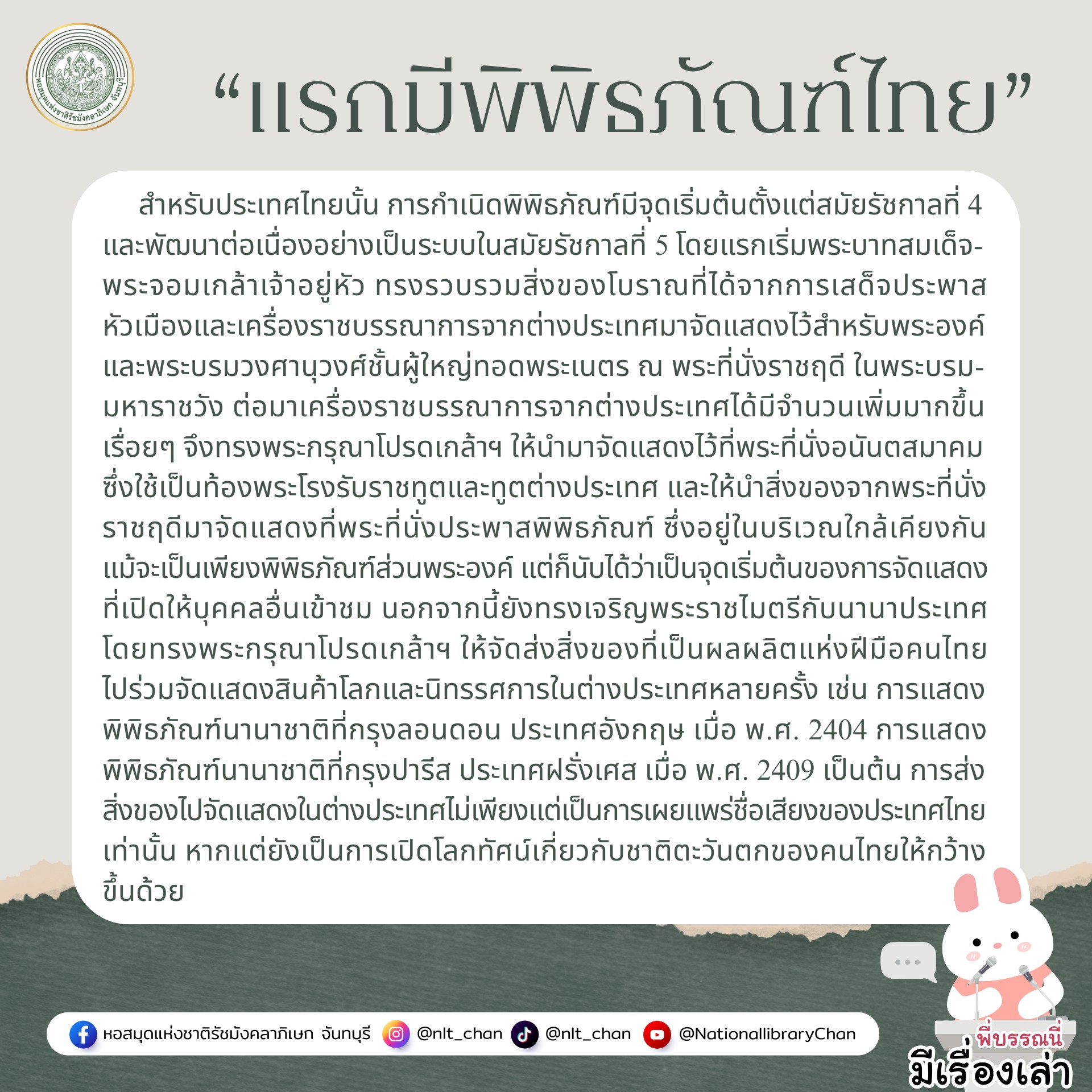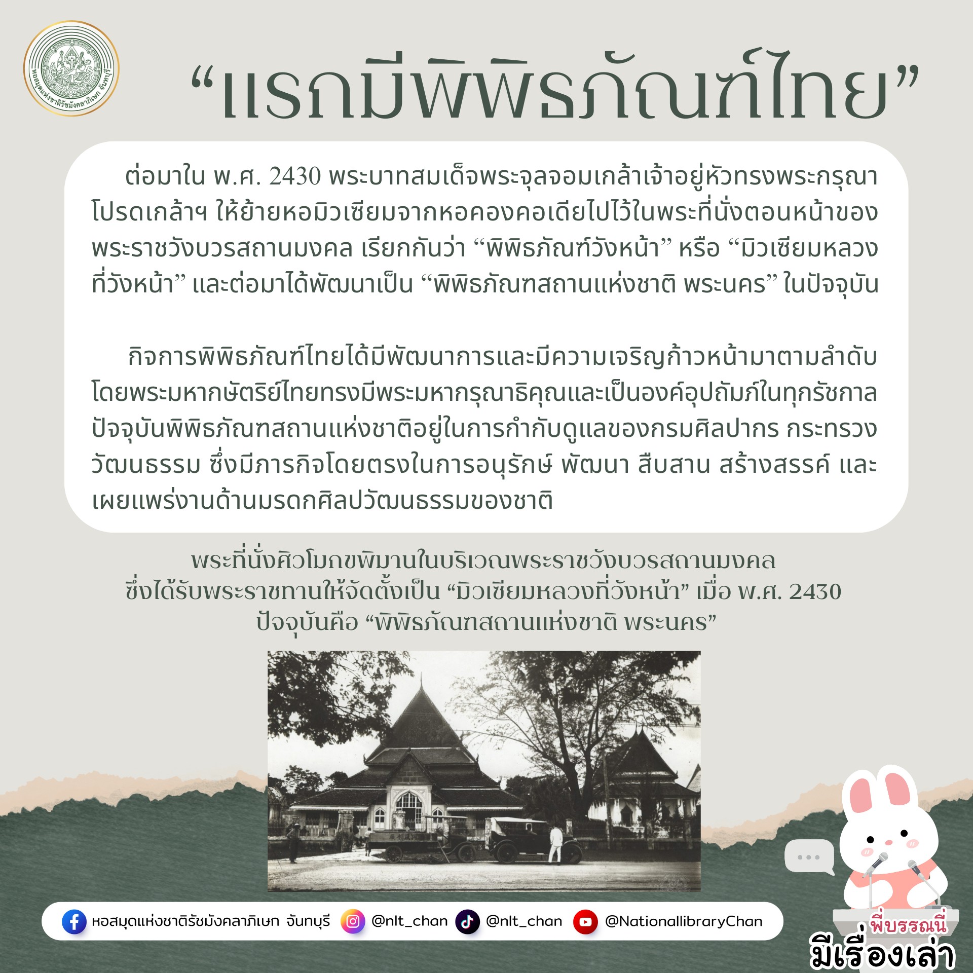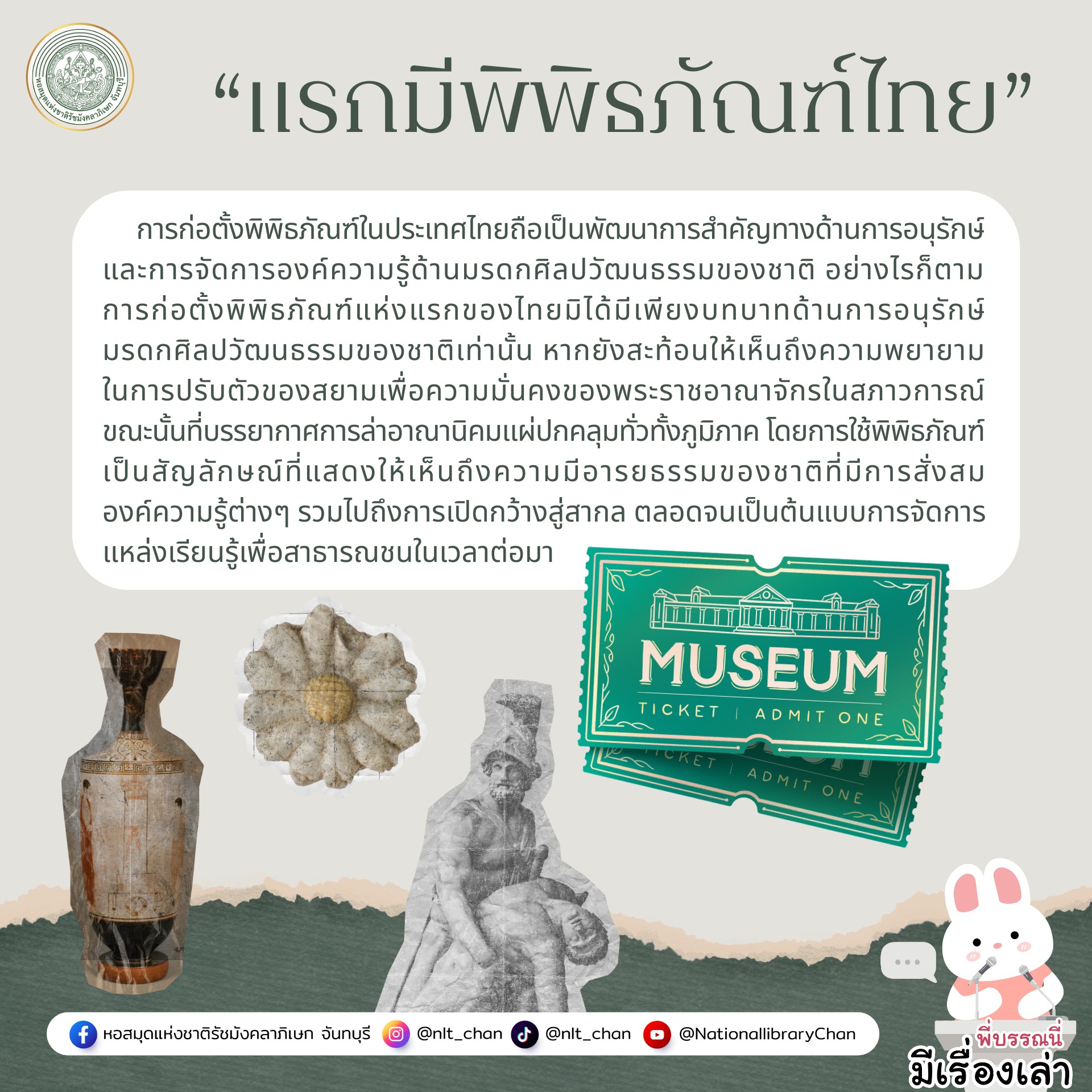 การก่อตั้งพิพิธภัณฑ์ในประเทศไทยถือเป็นพัฒนาการสำคัญทางด้านการอนุรักษ์และการจัดการองค์ความรู้ด้านมรดกศิลปวัฒนธรรมของชาติ อย่างไรก็ตามการก่อตั้งพิพิธภัณฑ์แห่งแรกของไทยมิได้มีเพียงบทบาทด้านการอนุรักษ์มรดกศิลปวัฒนธรรมของชาติเท่านั้น หากยังสะท้อนให้เห็นถึงความพยายามในการปรับตัวของสยามเพื่อความมั่นคงของพระราชอาณาจักรในสภาวการณ์