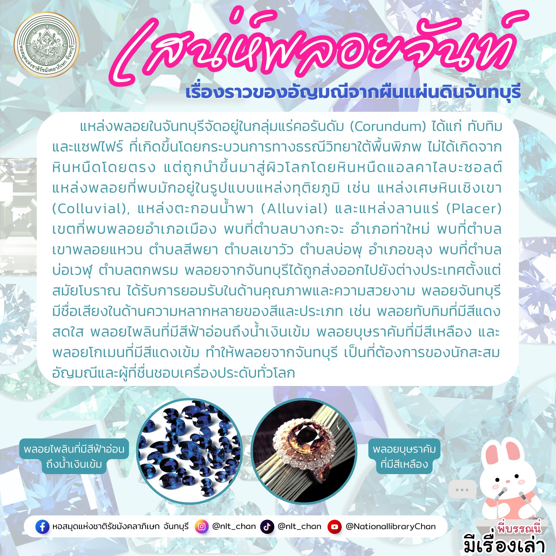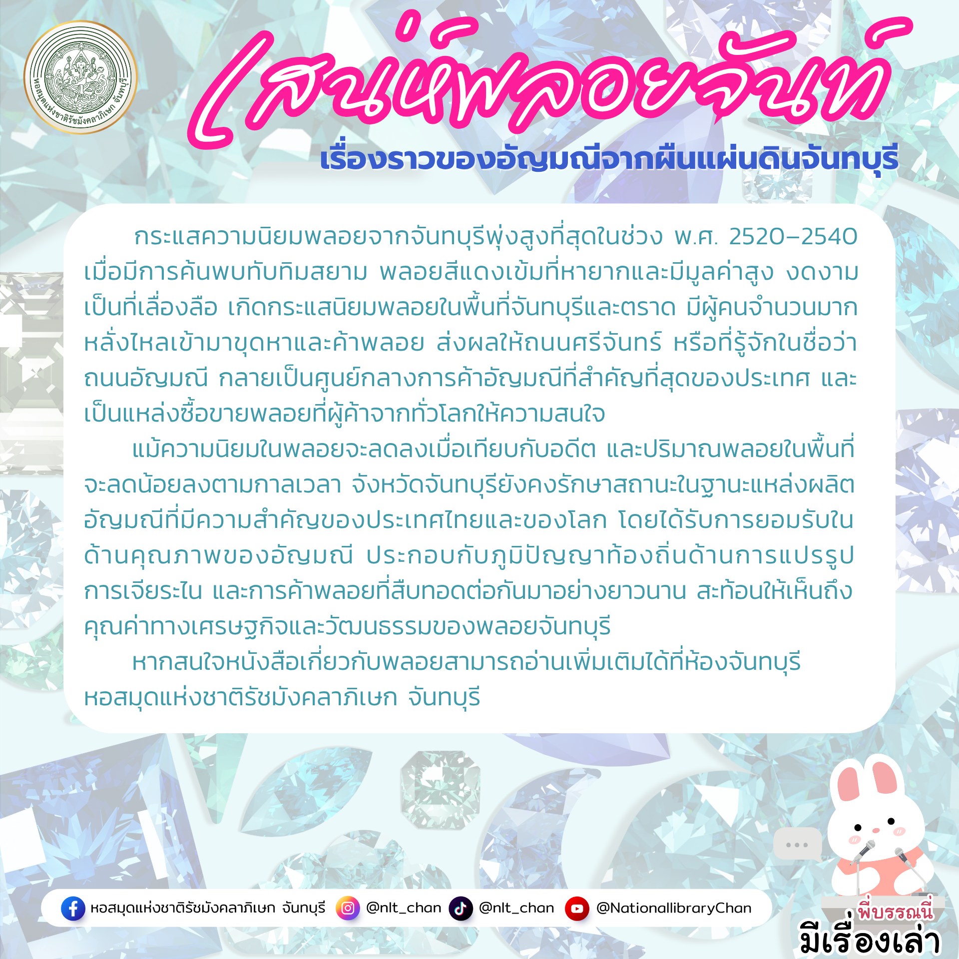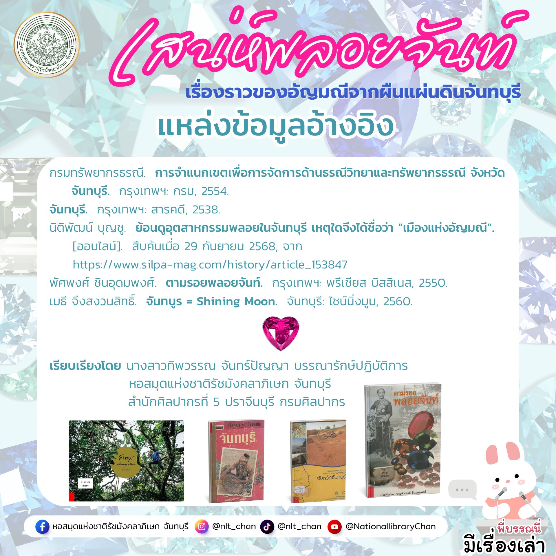 หากสนใจหนังสือเกี่ยวกับพลอยสามารถอ่านเพิ่มเติมได้ที่ห้องจันทบุรี หอสมุดแห่งชาติรัชมังคลาภิเษก จันทบุรี