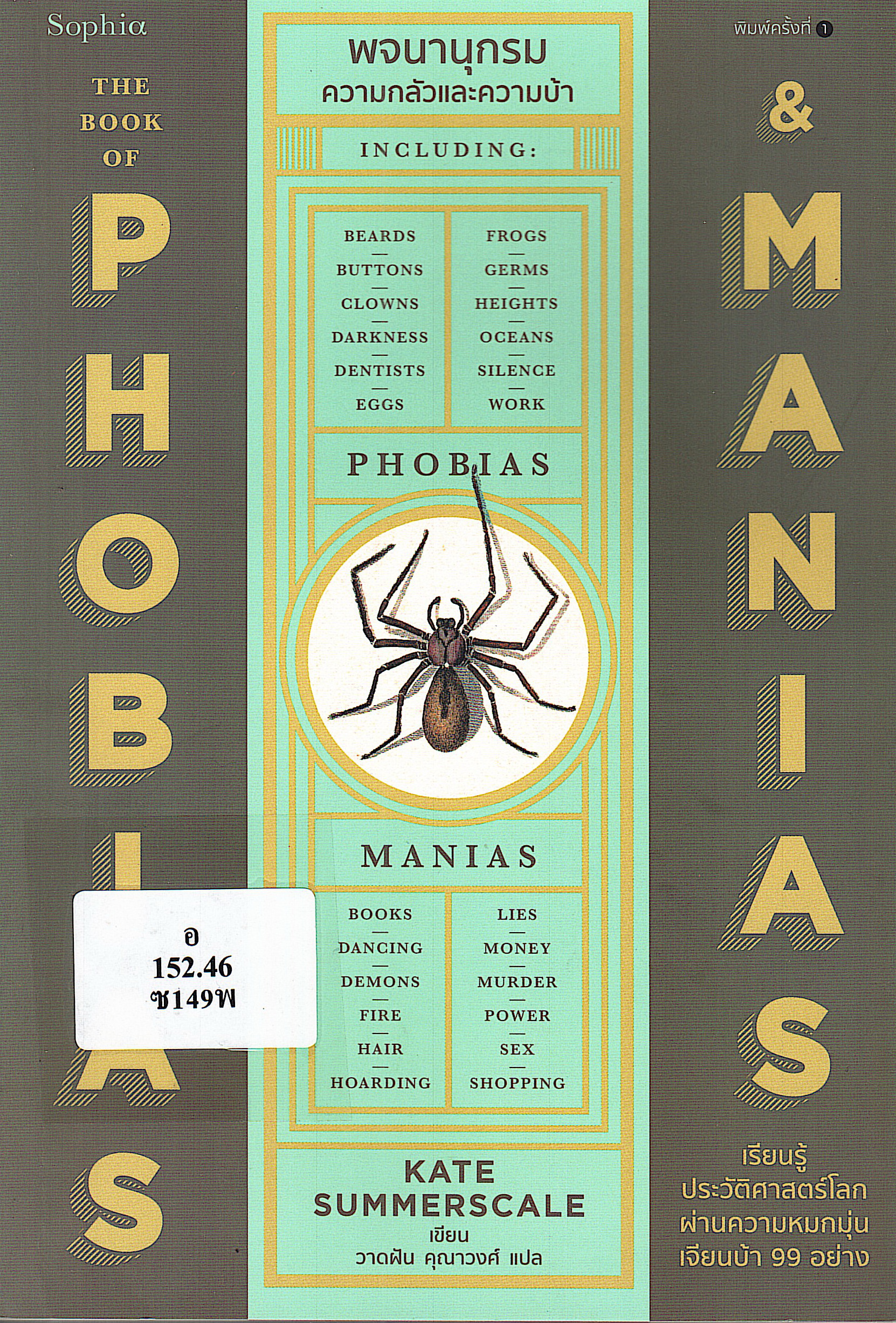 หนังสือเล่มนี้รวบรวมคำศัพท์ภาษาอังกฤษเกี่ยวกับความกลัวและความบ้า ที่เกิดขึ้นกับมนุษย์ ความกลัวสัตว์ มีวงเล็บคำแปลภาษาไทย จำนวนกว่า 99 คำ เรียงลำดับตัวอักษร A - Z เนื้อหา ตั้งแต่คำศัพท์ A Ablutophobia (อาการกลัวการอาบน้ำ) ถึง Z Zoophobia (อาการกลัวสัตว์) แต่ละคำศัพท์อธิบายลักษณะอาการ การแสดงพฤติกรรม พร้อมยกตัวอย่างที่ผ่านมาหลายยุคหลายสมัยของต่างประเทศ พร้อมทั้งการเฝ้าดูแลบำบัดรักษา จากนักจิตวิทยาและแพทย์