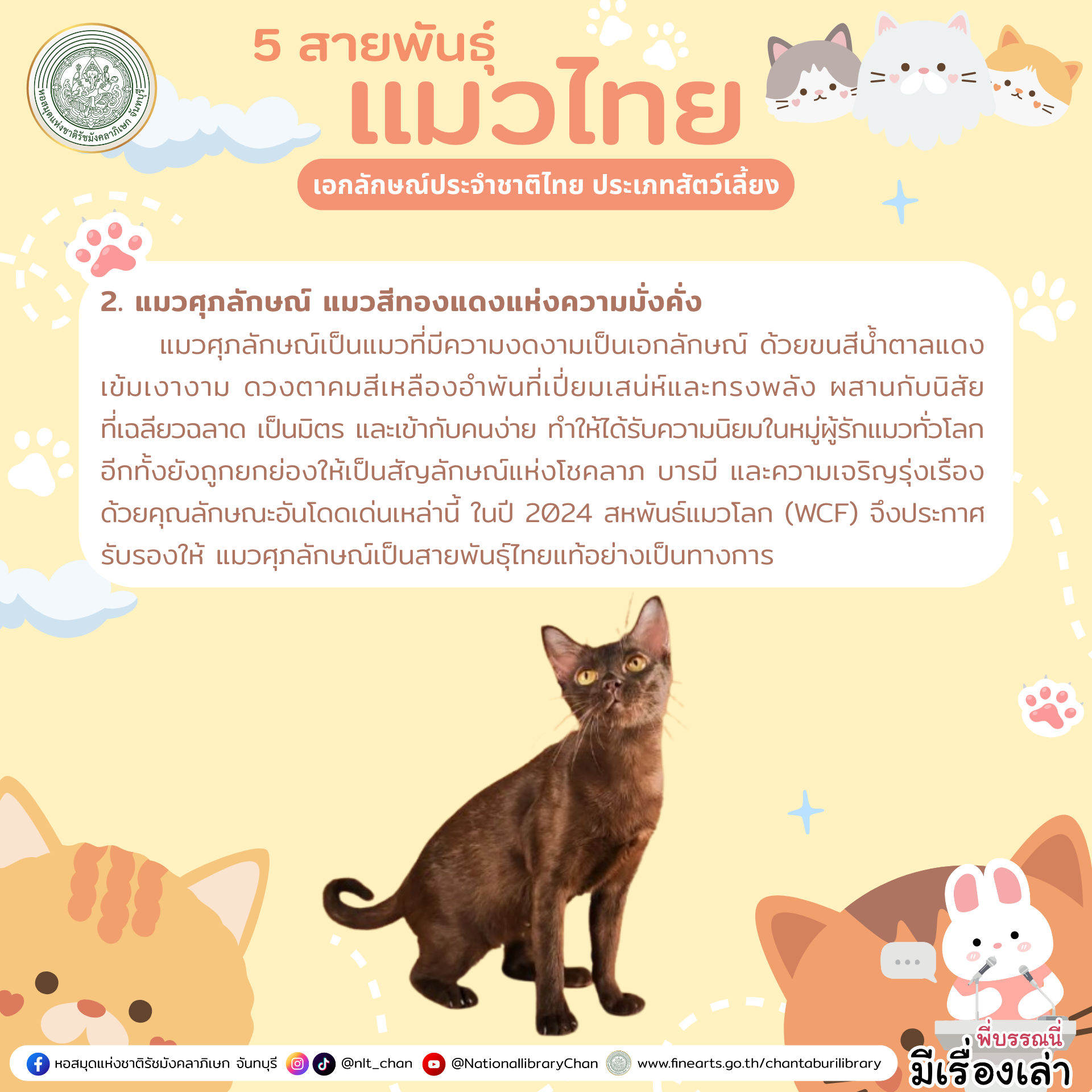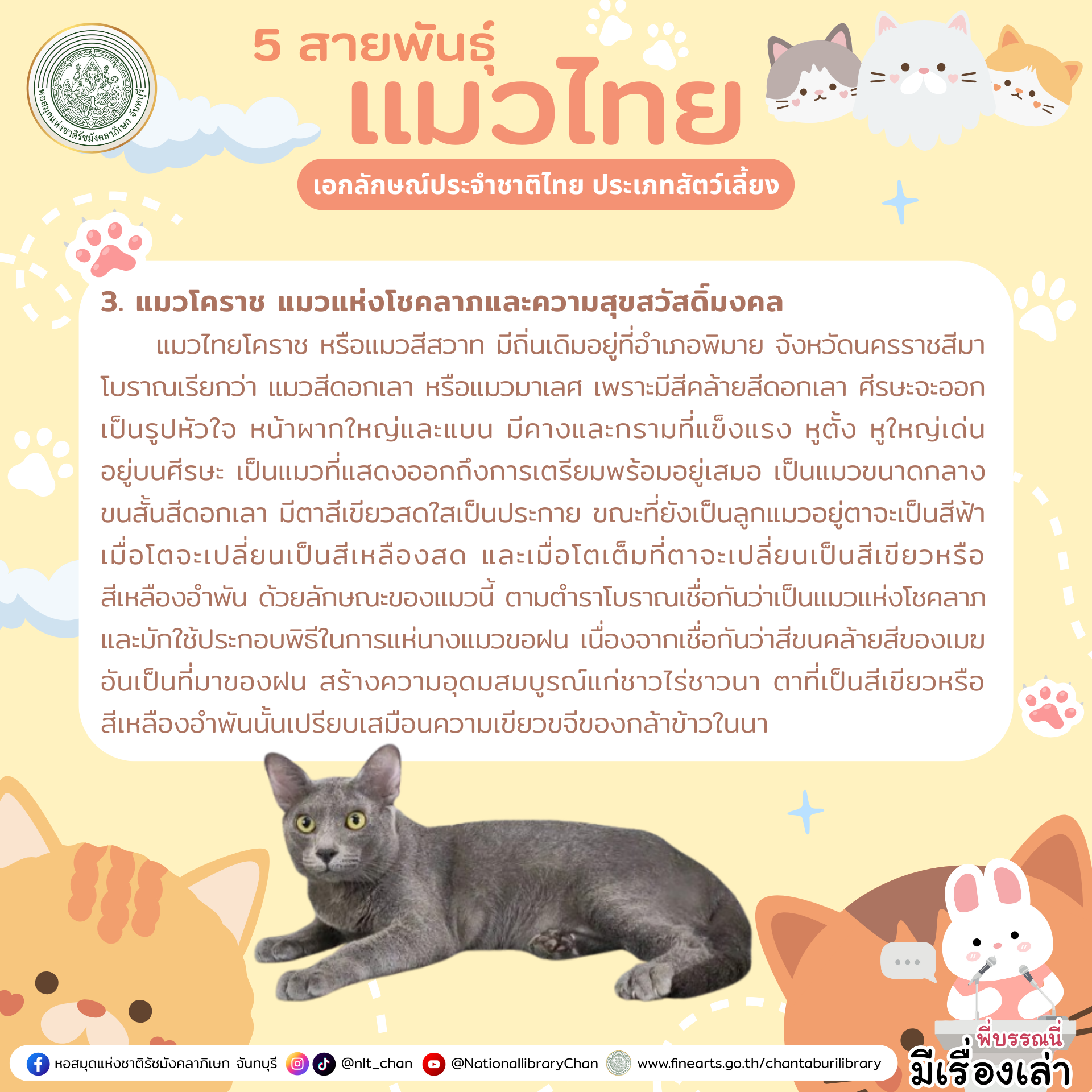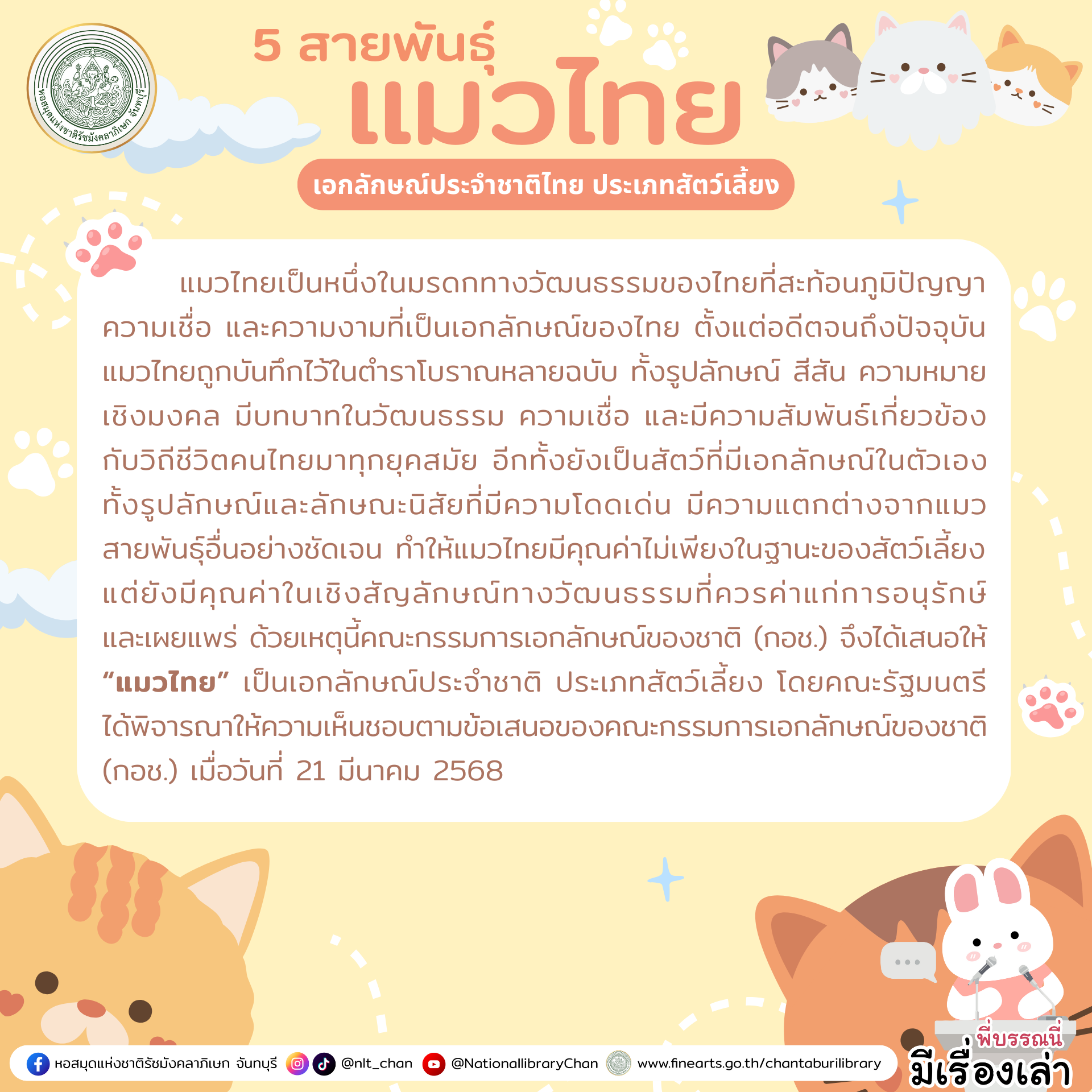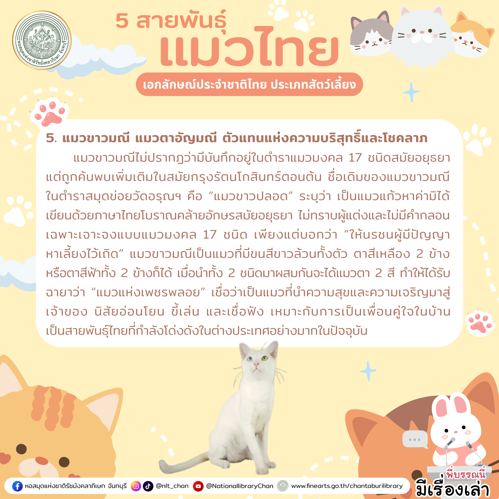หอสมุดแห่งชาติรัชมังคลาภิเษก จันทบุรี จะพาไปรู้จัก 5 สายพันธุ์แมวไทย ที่ได้รับการยอมรับทั้งในประเทศและต่างประเทศว่ามีเอกลักษณ์เฉพาะตัวของแมวไทย ได้แก่ แมววิเชียรมาศ แมวศุภลักษณ์ แมวโคราช แมวโกญจา หรือโกนจา และแมวขาวมณี