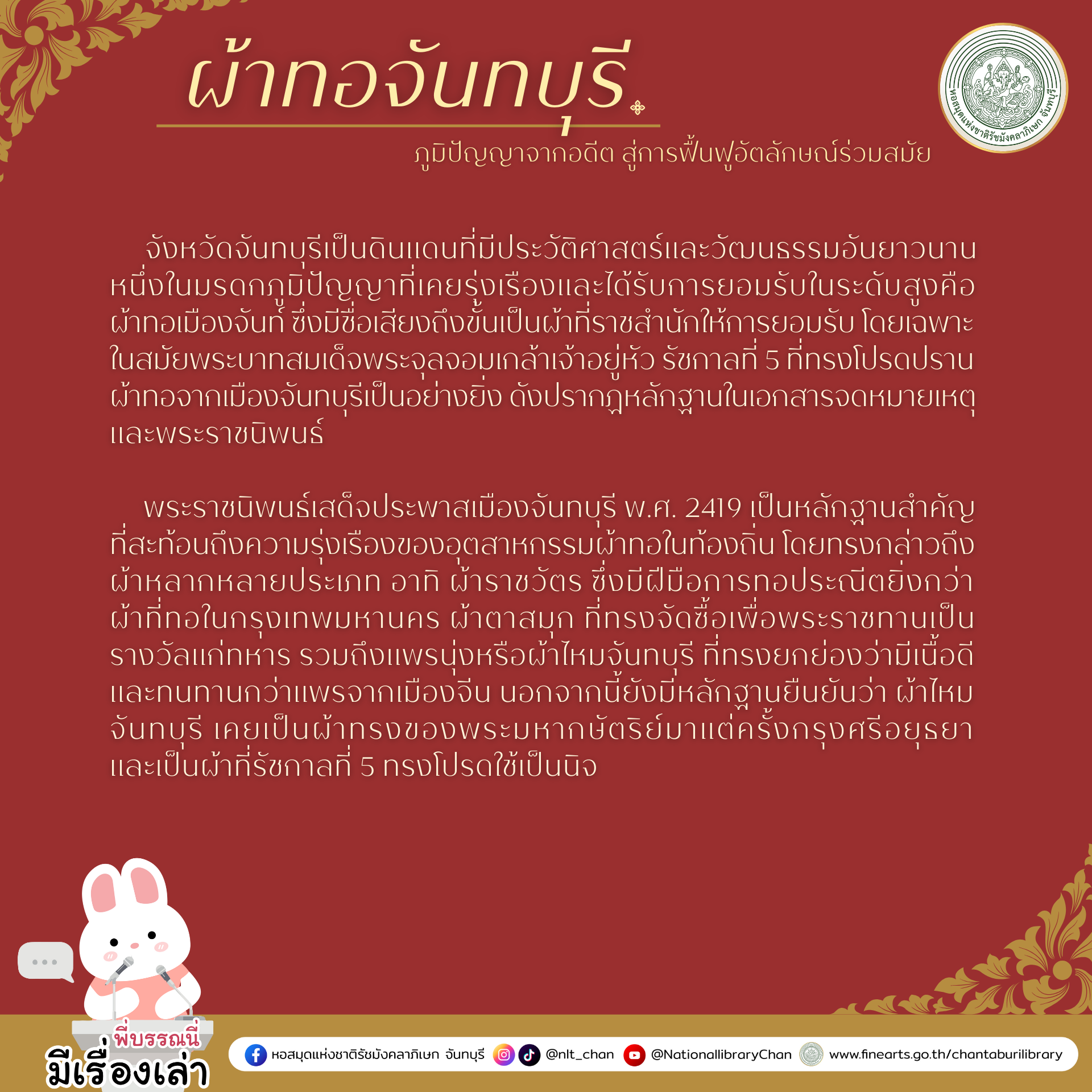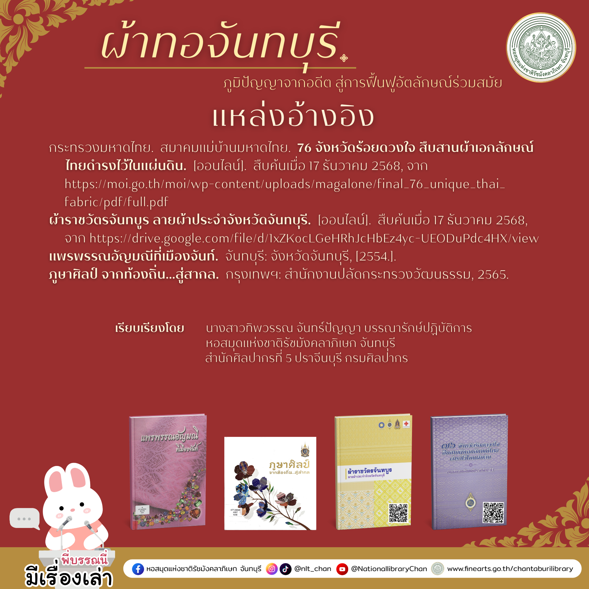 ผ้าราชวัตรจันทบูร ลายผ้าประจำจังหวัดจันทบุรี. [ออนไลน์]. สืบค้นเมื่อ 17 ธันวาคม 2568, จาก https://drive.google.com/file/d/1xZKocLGeHRhJcHbEz4yc-UEODuPdc4HX/view