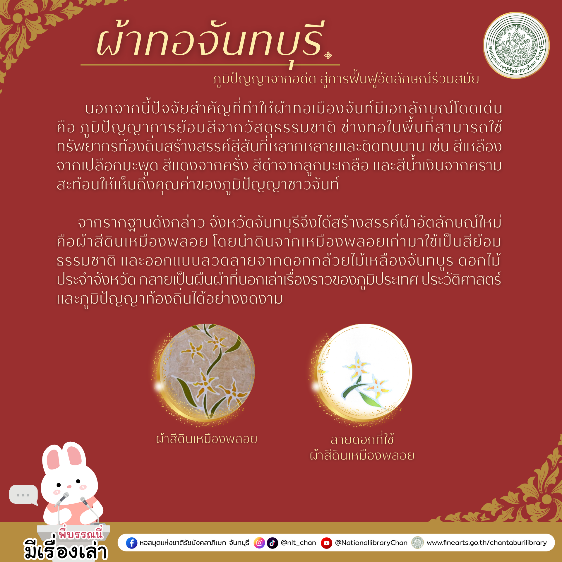 การฟื้นฟูผ้าทอเมืองจันท์ในวันนี้จึงไม่ใช่เพียงการอนุรักษ์ผืนผ้า หากแต่เป็นการถักทออดีตสู่ปัจจุบันและอนาคต ใช้รากฐานทางวัฒนธรรมมาสร้างคุณค่าใหม่ และสืบสานอัตลักษณ์ของเมืองจันท์ให้คงอยู่และก้าวต่อไปอย่างยั่งยืน