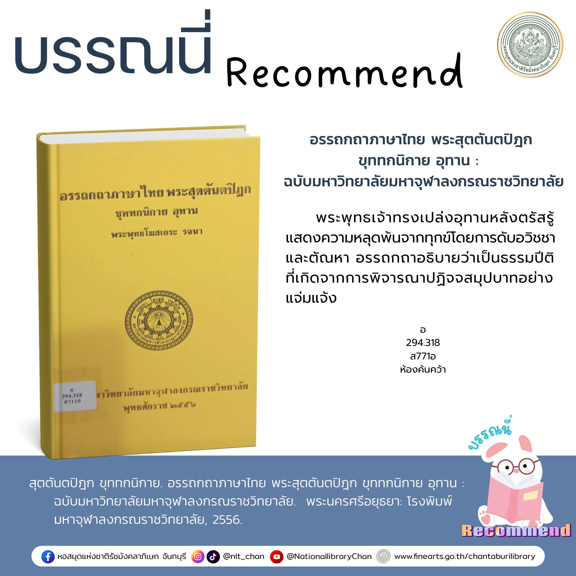สุตตันตปิฎก ขุททกนิกาย. อรรถกถาภาษาไทย พระสุตตันตปิฎก ขุททกนิกาย อุทาน :ฉบับมหาวิทยาลัยมหาจุฬาลงกรณราชวิทยาลัย. พระนครศรีอยุธยา: โรงพิมพ์มหาจุฬาลงกรณราชวิทยาลัย, 2556.