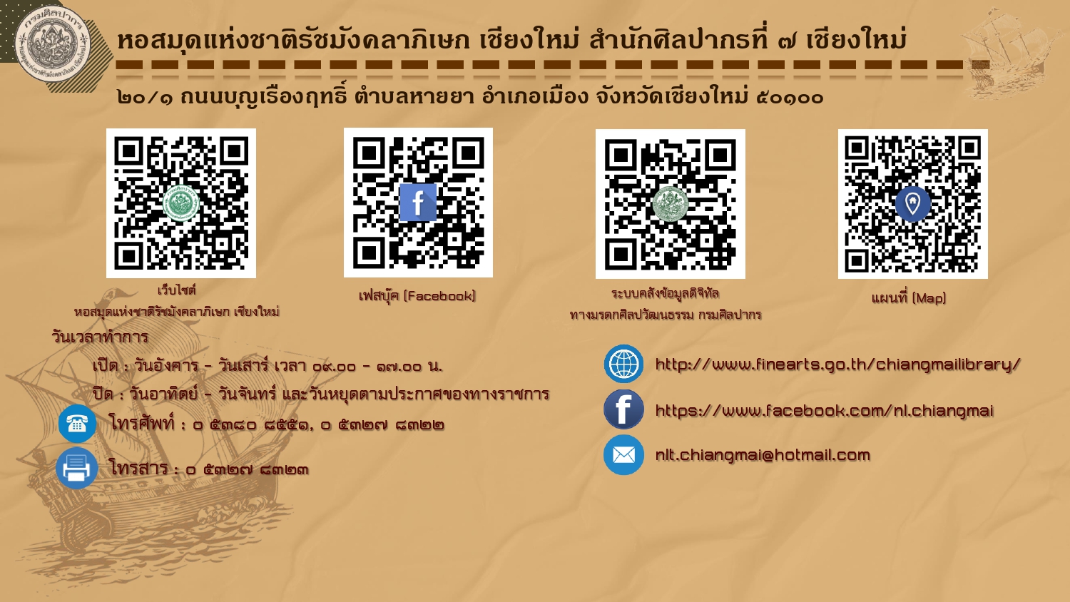 เรียบเรียงโดย : นายธีรบูลย์ มิตรมโนชัย นักวิชาการโสตทัศนศึกษาชำนาญการ หอสมุดแห่งชาติรัชมังคลาภิเษก เชียงใหม่ สำนักศิลปากรที่ ๗ เชียงใหม่ กรมศิลปากร กระทรวงวัฒนธรรม