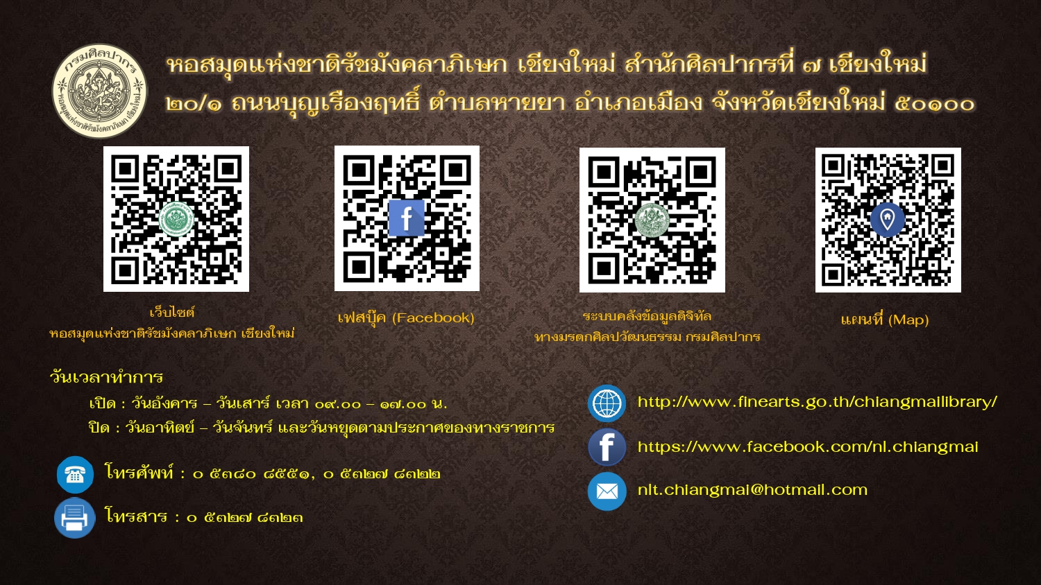 หอสมุดแห่งชาติรัชมังคลาภิเษก เชียงใหม่ สำนักศิลปากรที่ ๗ เชียงใหม่ กรมศิลปากร กระทรวงวัฒนธรรม
