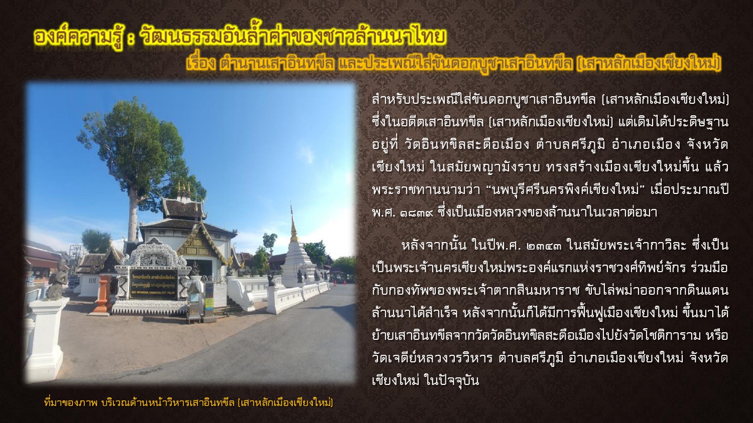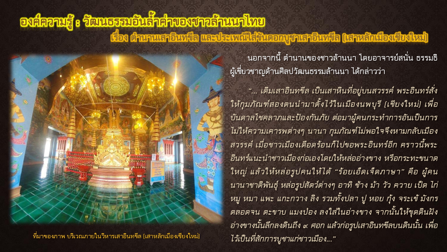 สนั่น ธรรมธิ. ประเพณีบูชาเสาอินทขีล. [ออนไลน์]. สืบค้นเมื่อ ๒๐ พฤษภาคม ๒๕๖๘, จาก: https://accl.cmu.ac.th/Knowledge/details/2637, ๒๕๖๕.