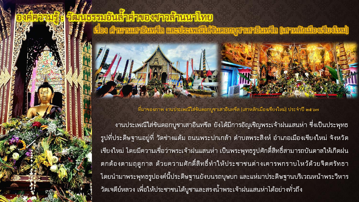 มิวเซียม สยาม. ประเพณีเข้าอินทขิล ตำนานอินทขิลและประเพณีบูชาอินทขิล. [ออนไลน์]. สืบค้นเมื่อ ๒๐ พฤษภาคม ๒๕๖๘,
