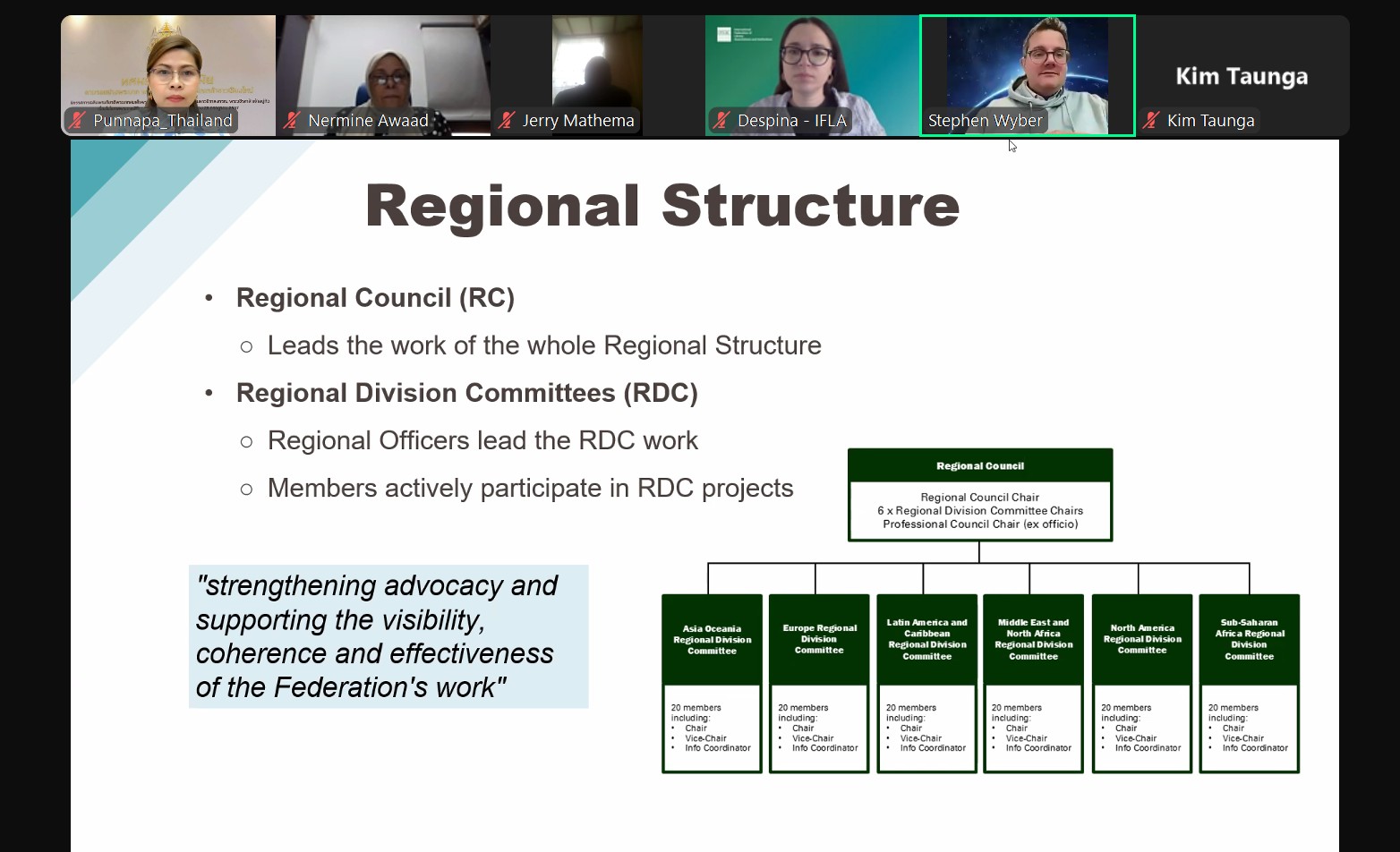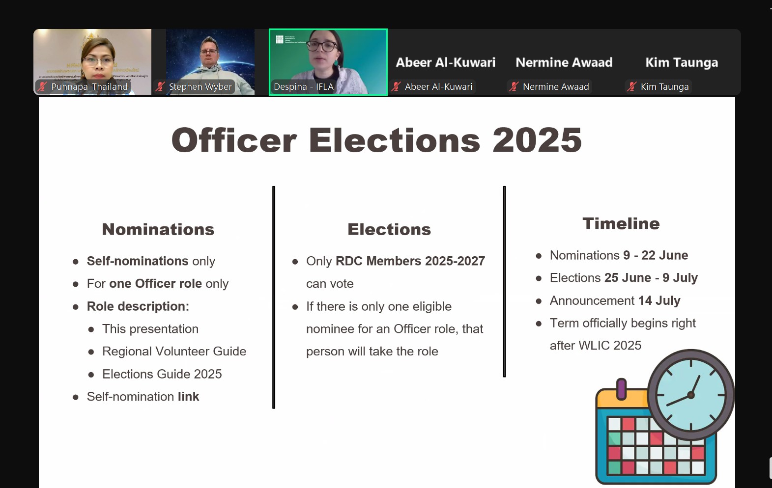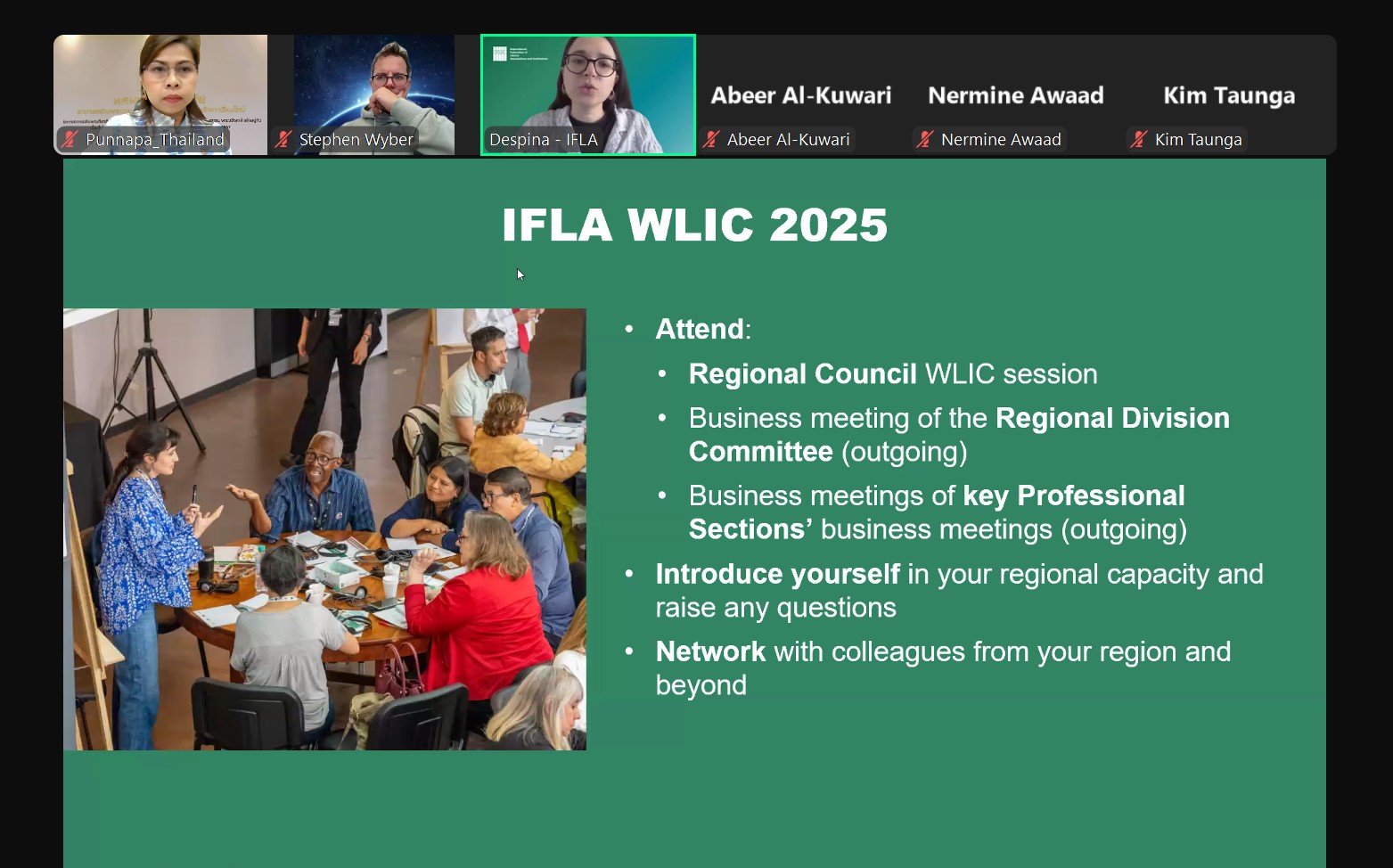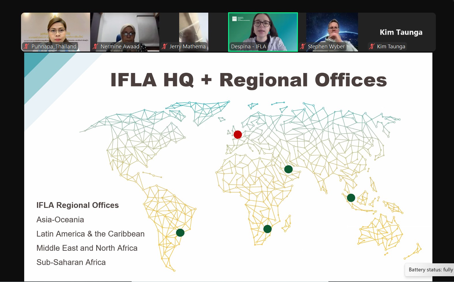 Miss Punnapa Suksakorn Director, Ratchamangklaphisek National Library Chiang Mai, Thailand, IFLA Asia – Oceania Reginal Division Committee 2025 – 2027 attended the online meeting of IFLA’s Regional Division Committees, “An Initial Briefing Virtual Meeting” facilitated by IFLA HQ, Wednesday 28 May 2025 at 14.30-15.30 hrs.