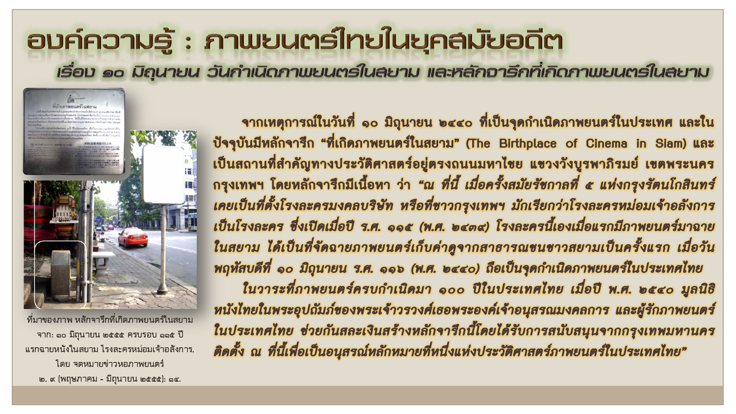 จากเหตุการณ์ในวันที่ ๑๐ มิถุนายน ๒๔๔๐ ที่เป็นจุดกำเนิดภาพยนตร์ในประเทศ และในปัจจุบันมีหลักจารึก “ที่เกิดภาพยนตร์ในสยาม” (The Birthplace of Cinema in Siam) และเป็นสถานที่สำคัญทางประวัติศาสตร์อยู่ตรงถนนมหาไชย แขวงวังบูรพาภิรมย์ เขตพระนคร กรุงเทพฯ โดยหลักจารึกมีเนื้อหา ว่า “ณ ที่นี้ เมื่อครั้งสมัยรัชกาลที่ ๕ แห่งกรุงรัตนโกสินทร์เคยเป็นที่ตั้งโรงละครมงคลบริษัท หรือที่ชาวกรุงเทพฯ มักเรียกว่าโรงละครหม่อมเจ้าอลังการ เป็นโรงละคร ซึ่งเปิดเมื่อปี ร.ศ. ๑๑๕ (พ.ศ. ๒๔๓๙) โรงละครนี้เองเมื่อแรกมีภาพยนตร์มาฉายในสยาม ได้เป็นที่จัดฉายภาพยนตร์เก็บค่าดูจากสาธารณชนชาวสยามเป็นครั้งแรก เมื่อวันพฤหัสบดีที่ ๑๐ มิถุนายน ร.ศ. ๑๑๖ (พ.ศ. ๒๔๔๐) ถือเป็นจุดกำเนิดภาพยนตร์ในประเทศไทย