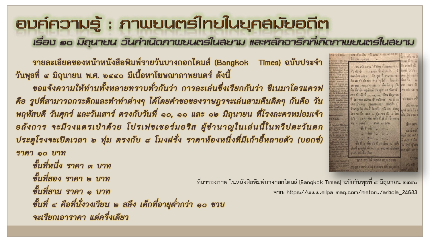 รายละเอียดของหน้าหนังสือพิมพ์รายวันบางกอกไตมส์ (Bangkok Times) ฉบับประจำวันพุธที่ ๙ มิถุนายน พ.ศ. ๒๔๔๐ มีเนื้อหาโฆษณาภาพยนตร์ ดังนี้