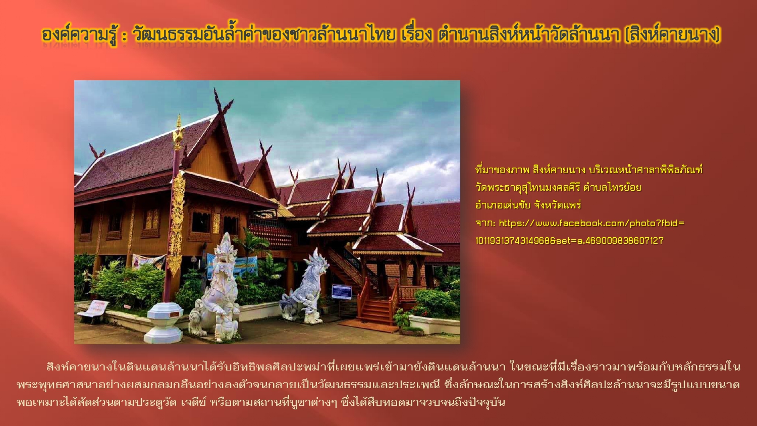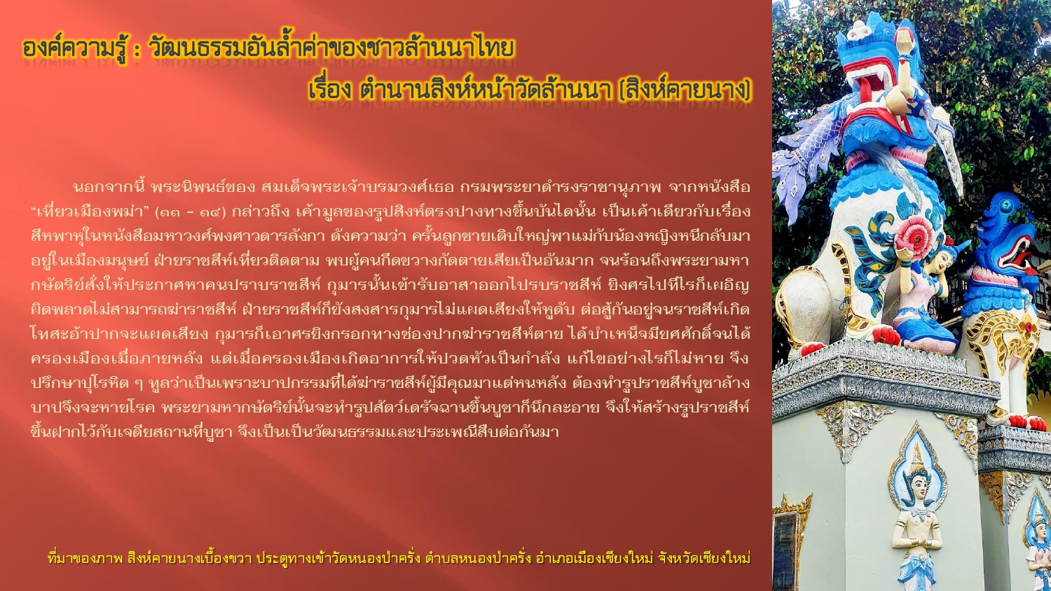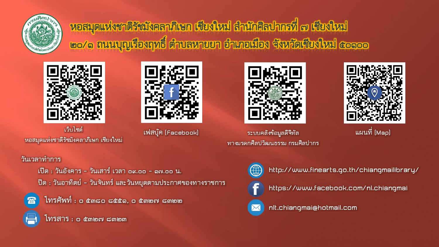 เรียบเรียงโดย : นายธีรบูลย์ มิตรมโนชัย นักวิชาการโสตทัศนศึกษาชำนาญการ หอสมุดแห่งชาติรัชมังคลาภิเษก เชียงใหม่ สำนักศิลปากรที่ ๗ เชียงใหม่ กรมศิลปากร กระทรวงวัฒนธรรม