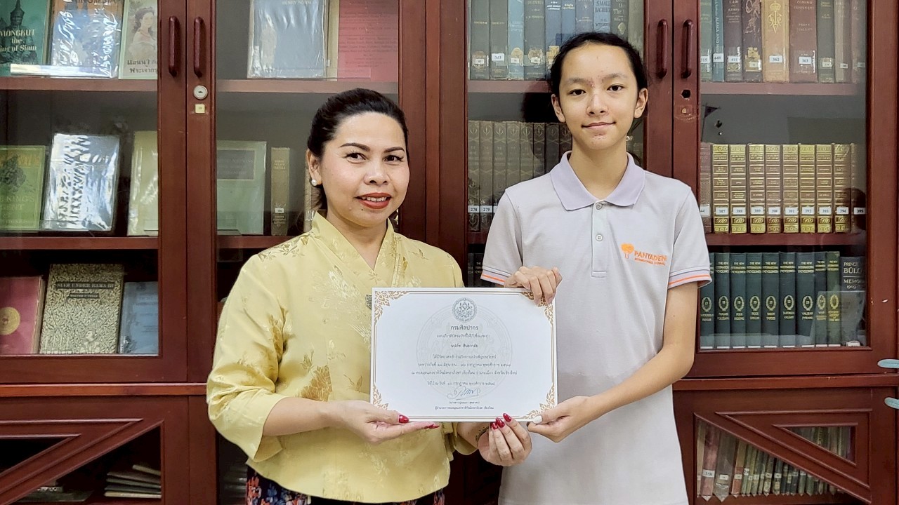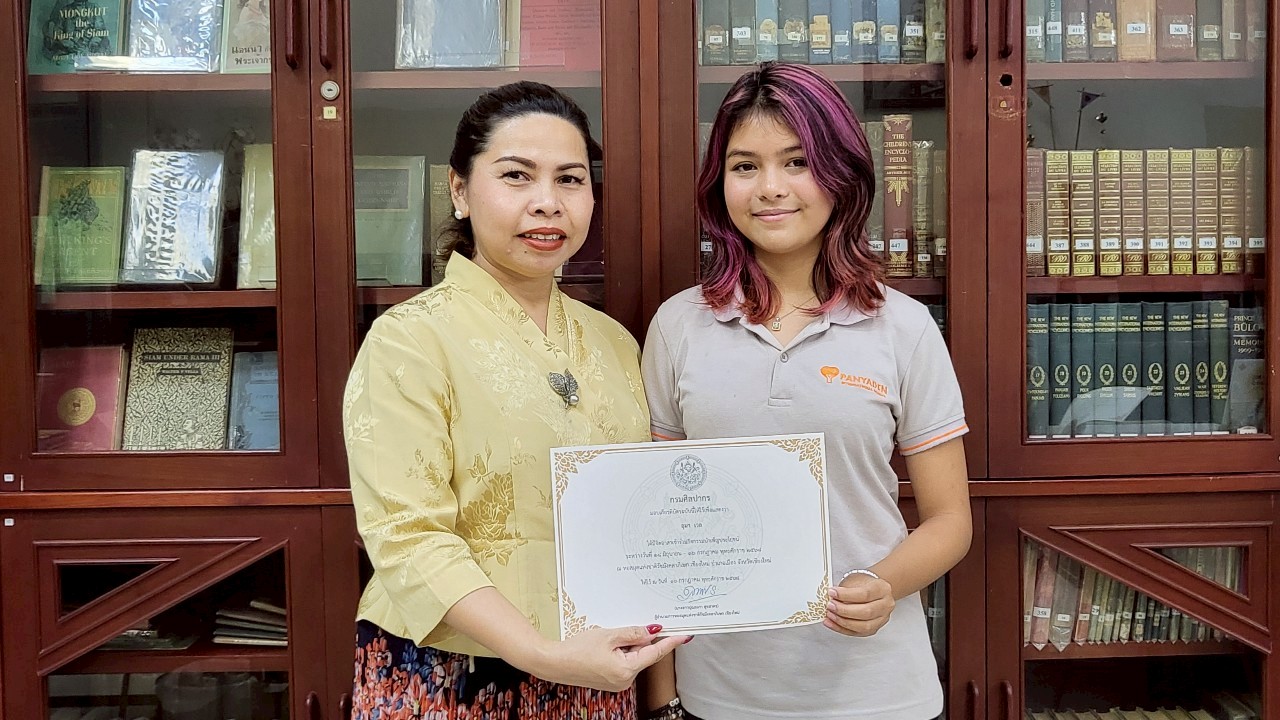 นางสาวปุณณภา สุขสาคร ผู้อำนวยการหอสมุดแห่งชาติรัชมังคลาภิเษก เชียงใหม่ มอบเกียรติบัตรให้แก่เยาวชนจิตอาสา จากโรงเรียนนานาชาติปัญญาเด่น (Panyaden International School)